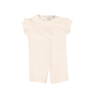 Adorable combishort ivoire pour bébé fille en coton doux et extensible. Il est doté d'un délicat volant en dentelle ivoire sur le devant et autour du col.