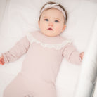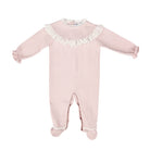 Adorable baby-body vieux rose en piqué de coton doux et extensible. Il est doté d'un délicat volant en dentelle ivoire avec des poignets élastiqués.