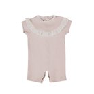Adorable combishort vieux rose pour bébé fille en piqué de coton doux et extensible. Il est doté d'un délicat volant en dentelle ivoire sur le devant et autour du col.