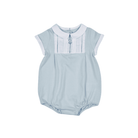 Barboteuse bleue bébé garçon confectionnée en jersey de coton doux. Il présente un nœud marin bleu clair brodé sur le col en lin et des boutons-pression au dos.