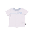 T-shirt blanc pour bébé garçon confectionné en jersey de coton doux. Il présente un nœud marin imprimé bleu clair sur la poitrine et des boutons-pression au dos.