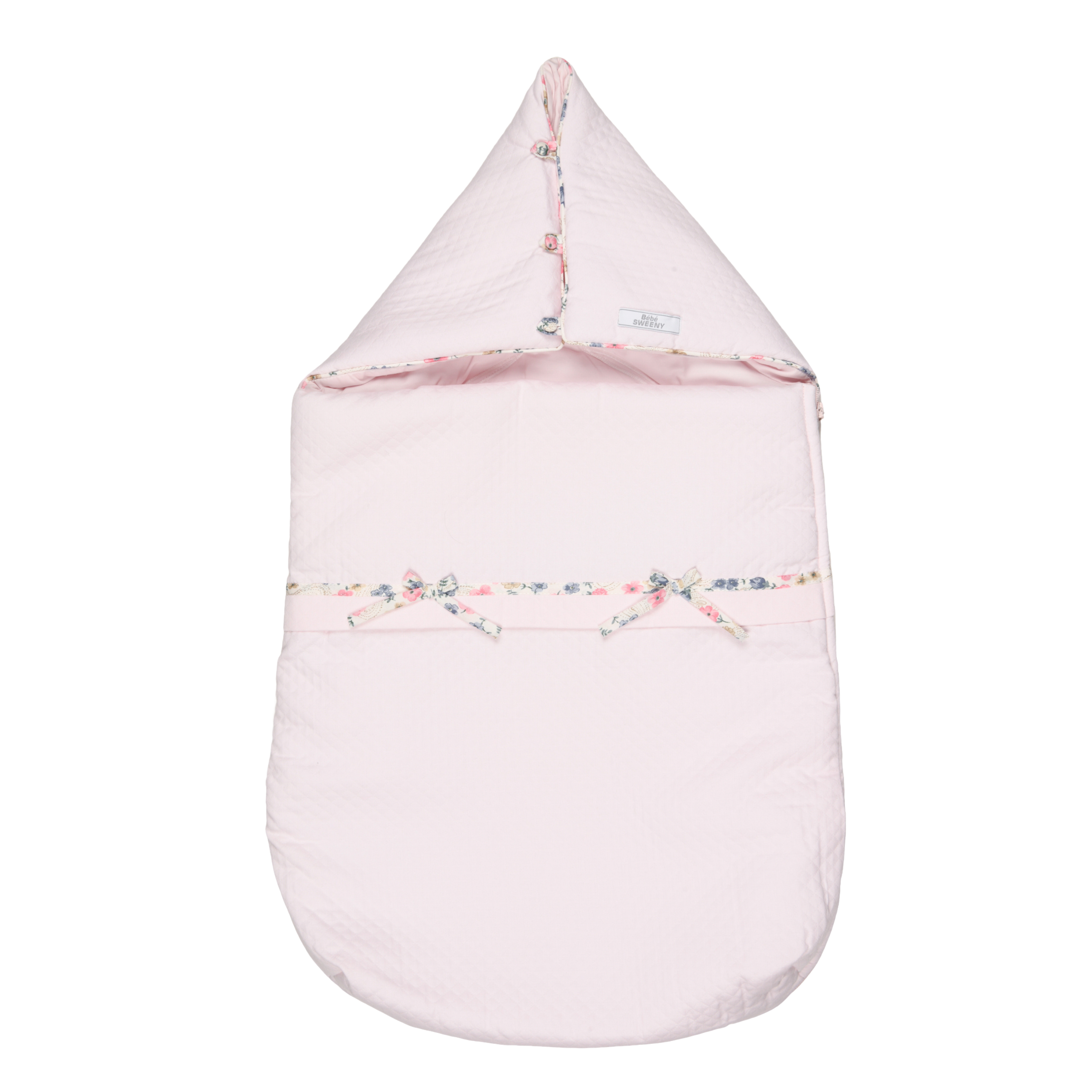 Votre bébé sera gardé au chaud, douillet et confortable dans ce sac guirlande en coton rose, idéal pour l'extérieur dans la poussette et dans le berceau. Il est doté d'un ruban fleuri rose sur le devant et d'un zip dissimulé sur le côté. Les boutons recouverts de tissu sur la capuche peuvent être ouverts pour former une surface plane et les trois fentes à l'arrière peuvent être utilisées pour fixer le nid à un siège auto ou une poussette.