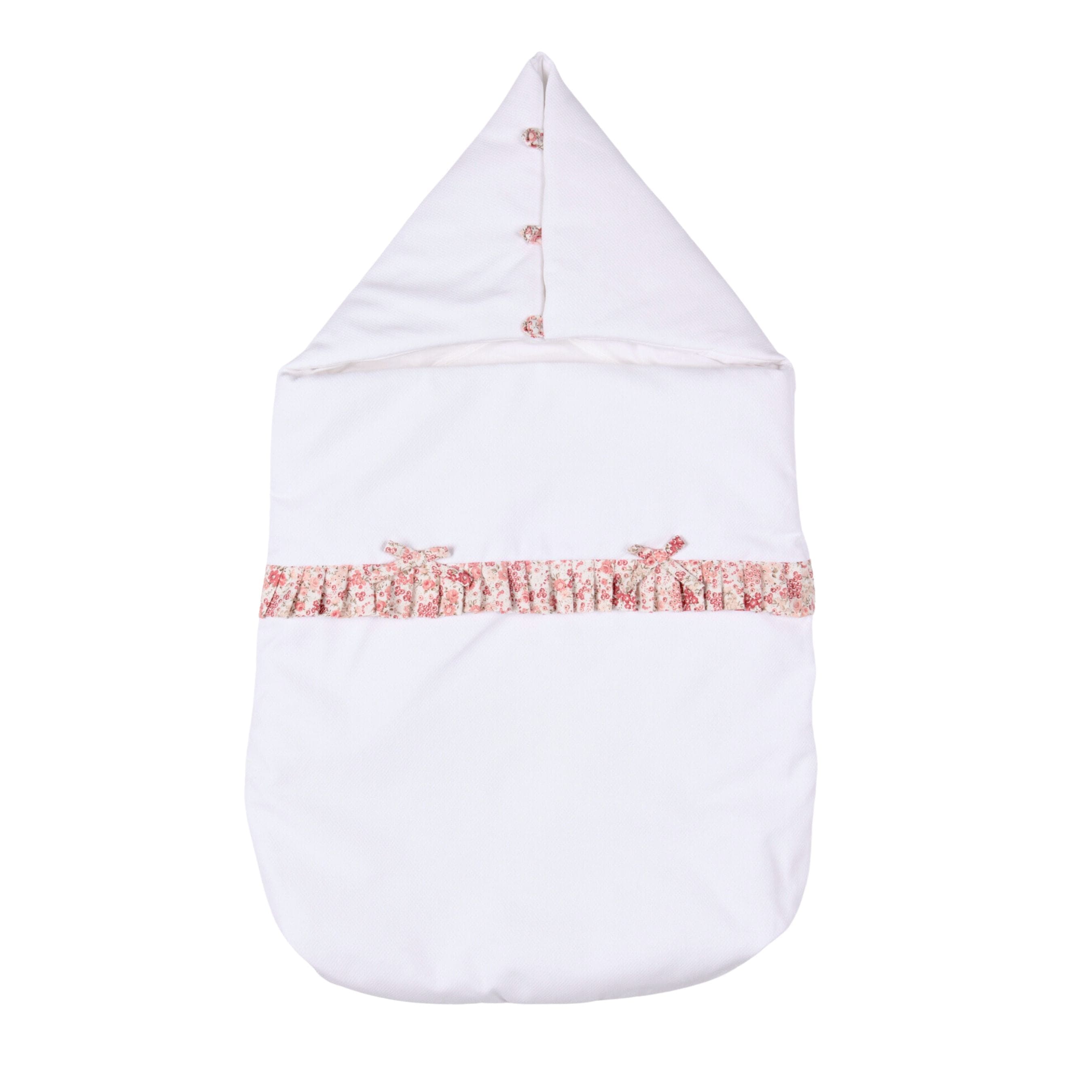 Votre bébé sera gardé au chaud, douillet et confortable dans ce sac à guirlandes en coton piqué blanc. Les boutons recouverts de tissu sur la capuche peuvent être ouverts pour former une surface plane et les trois fentes à l'arrière peuvent être utilisées pour fixer le nid à un siège auto ou une poussette.