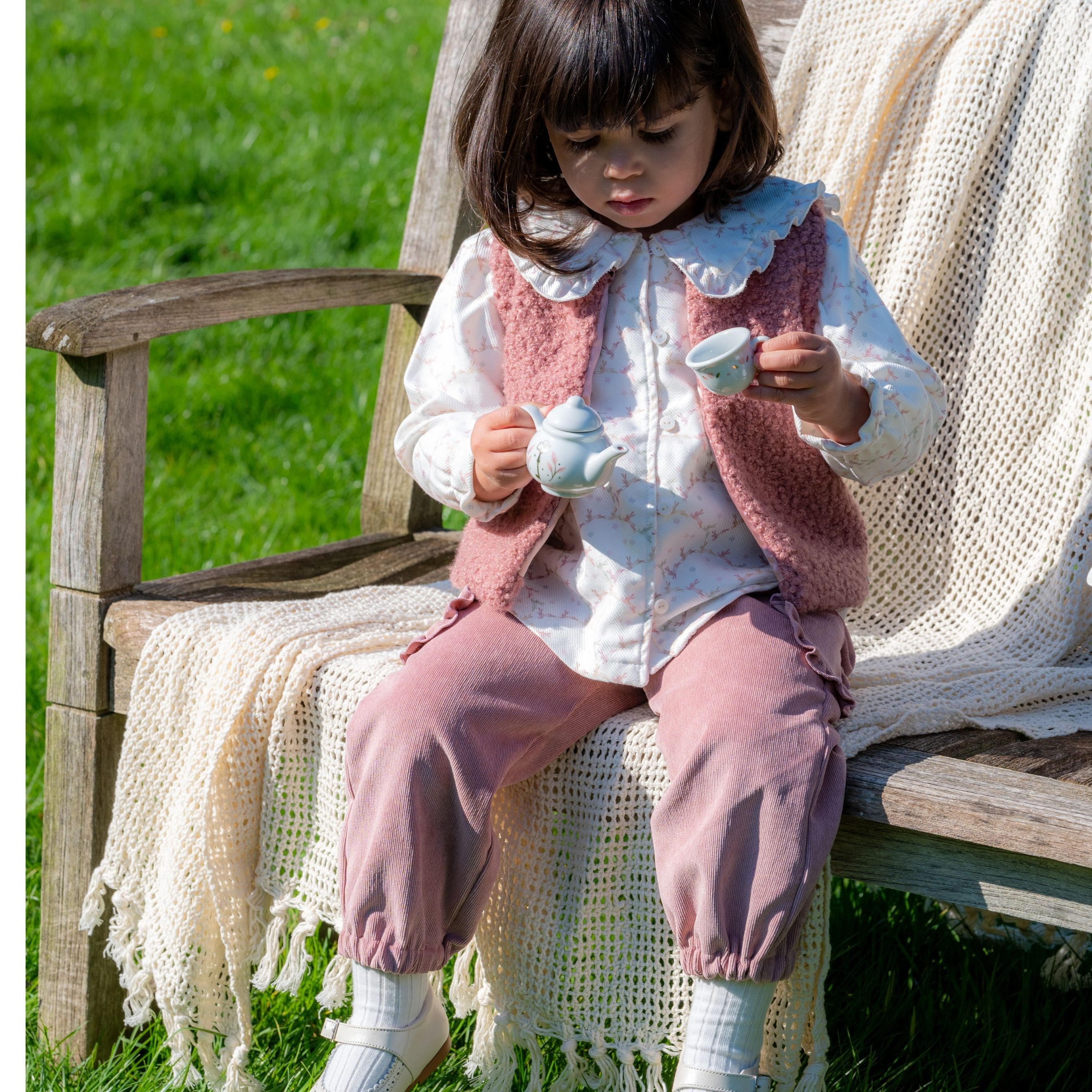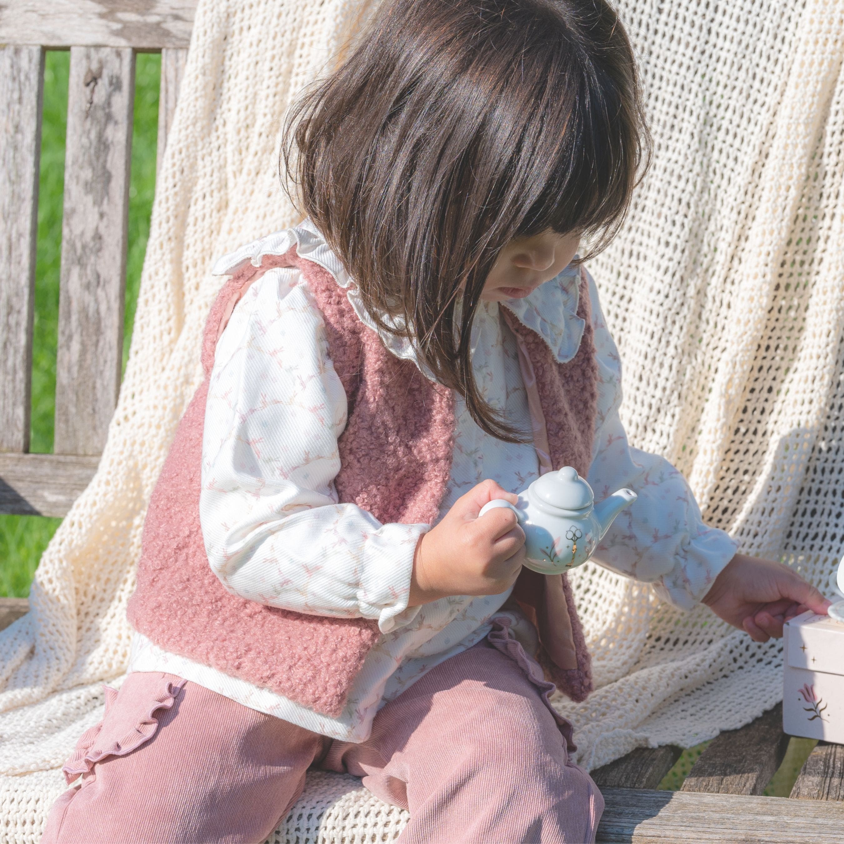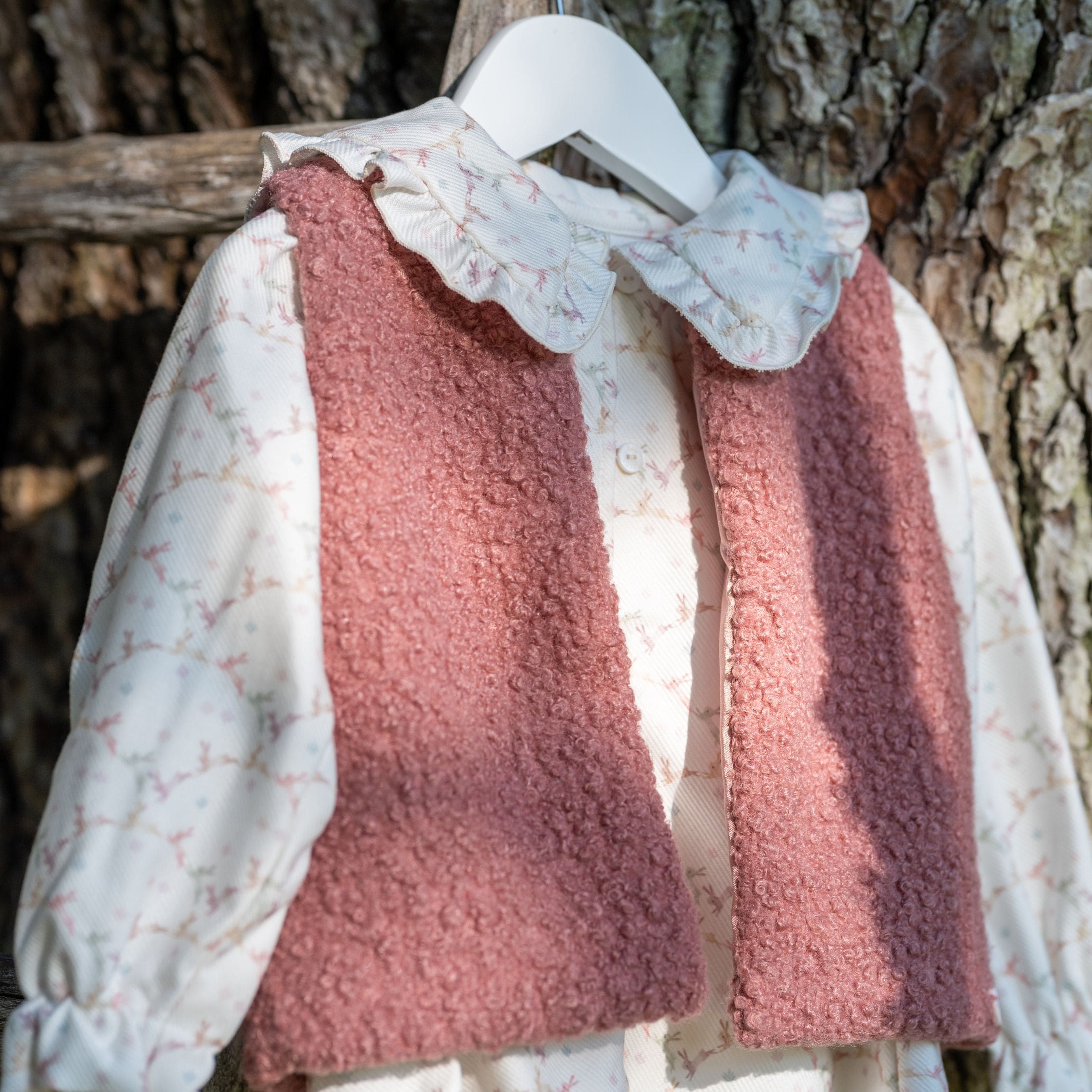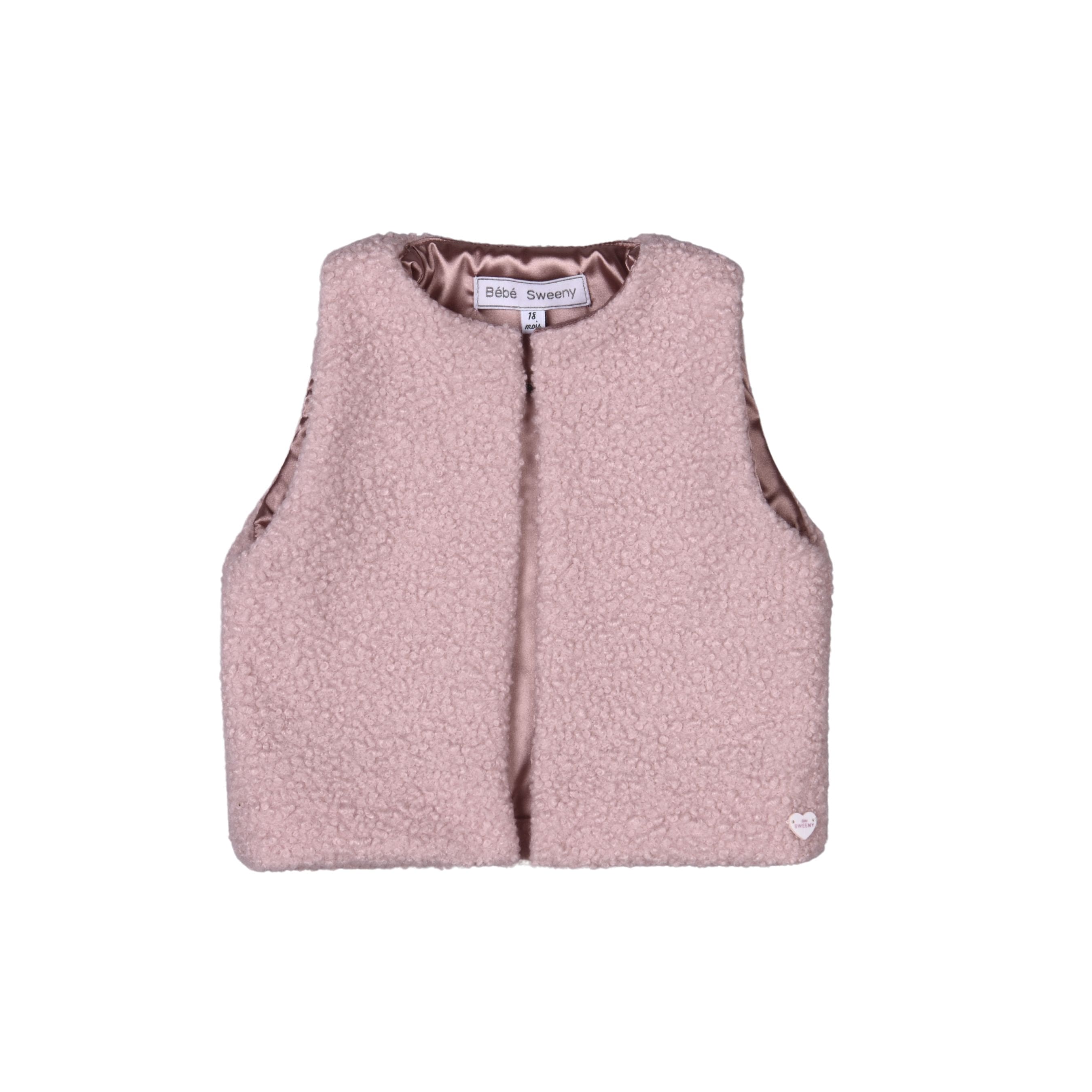 Made with plush and soft bouclé material, this  dusty rose gilet provides ultimate comfort for your child. Its fashion-forward design features a subtle front closure and serves as a perfect extra layer of warmth, complete with a smooth satin lining.
