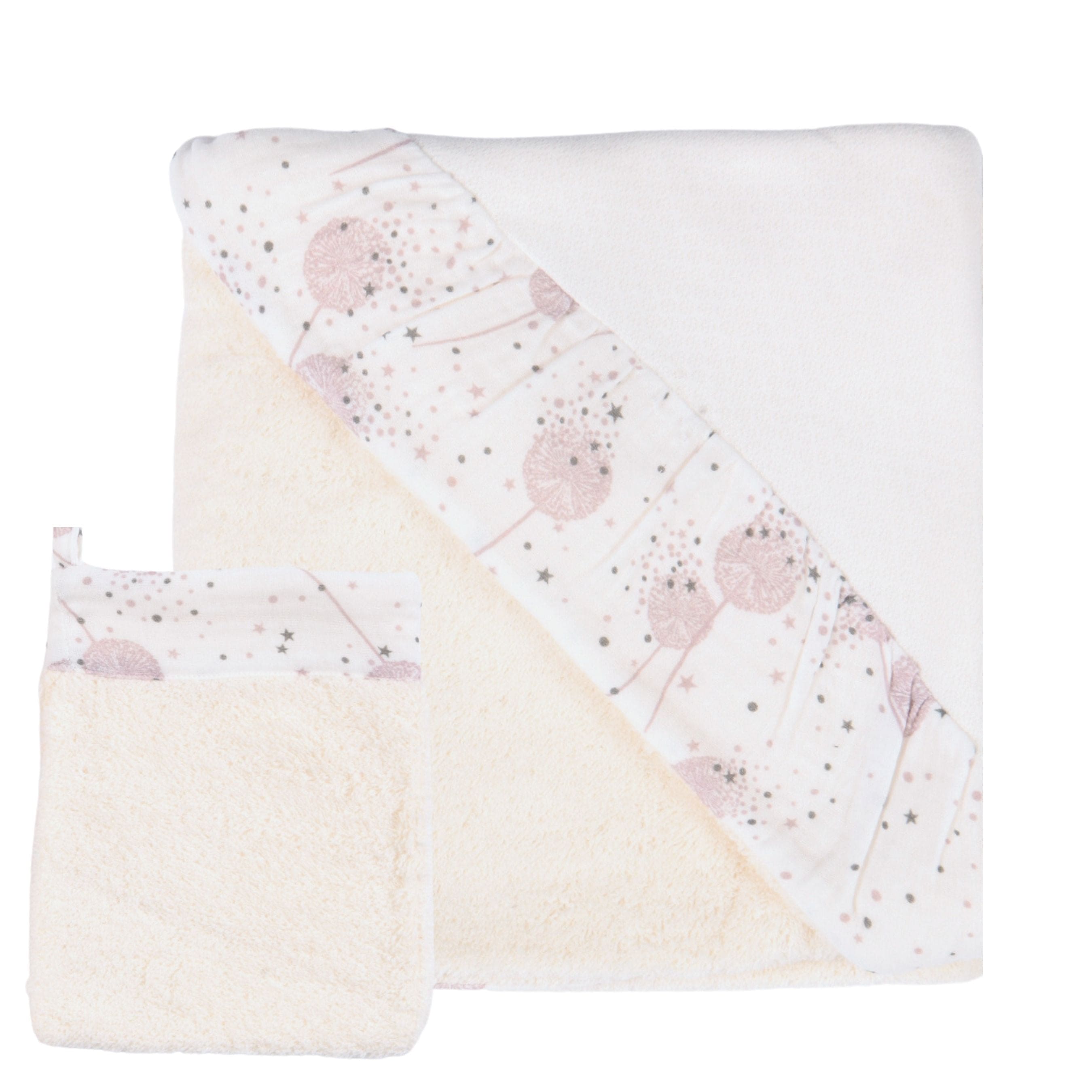 LILAS | Serviette à capuche et gant de toilette ivoire à finitions en mousseline