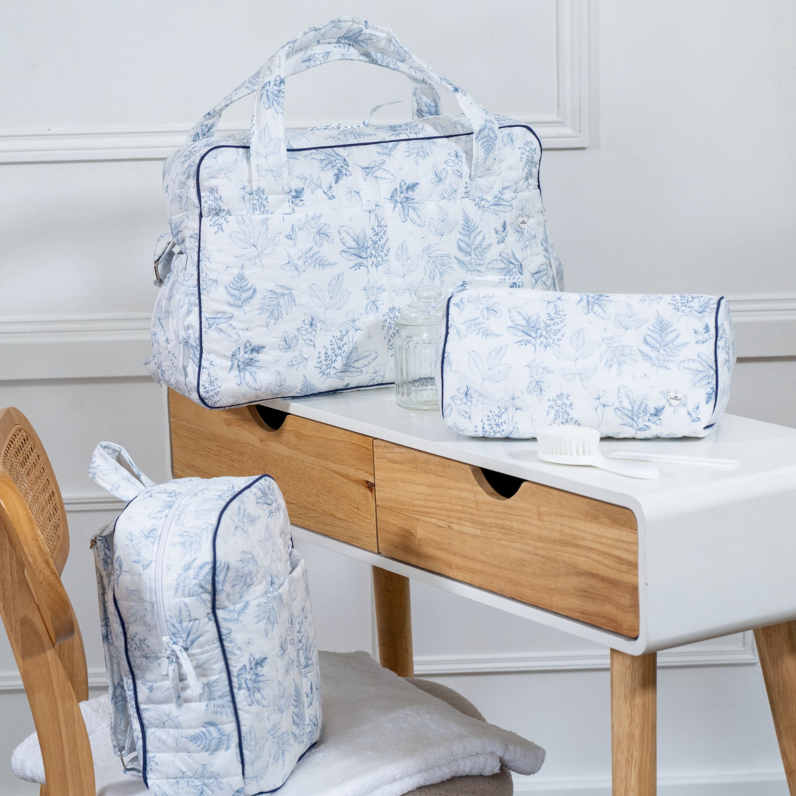 Elegant and practical toiletry bag designed to organize baby essentials at home or while traveling. This quilted pouch features our exclusive Bebe Sweeny Toile de Jouy print in Denim Blue. The interior is waterproof to protect from spills, while the delicate piping details and the small stitched heart logo add a refined signature touch.