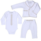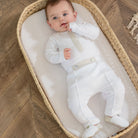 This three-piece set for boys is made from soft quilted cotton, featuring a long-sleeved jacket with beige and white gingham trims and mother of pearl button closures. The fitted pants have a lightly elasticated waistband for a comfortable fit, adorned with beautiful buttons. The white cotton bodysuit has a tie effect in beige and white gingham. Complete the look with booties from the same collection.