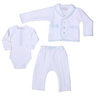 This three-piece set for boys is made from soft quilted cotton, featuring a long-sleeved jacket with blue and white gingham trims and mother of pearl button closures. The fitted pants have a lightly elasticated waistband for a comfortable fit, adorned with beautiful buttons. The white cotton bodysuit has a tie effect in blue and white gingham. Complete the look with booties from the same collection.
