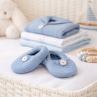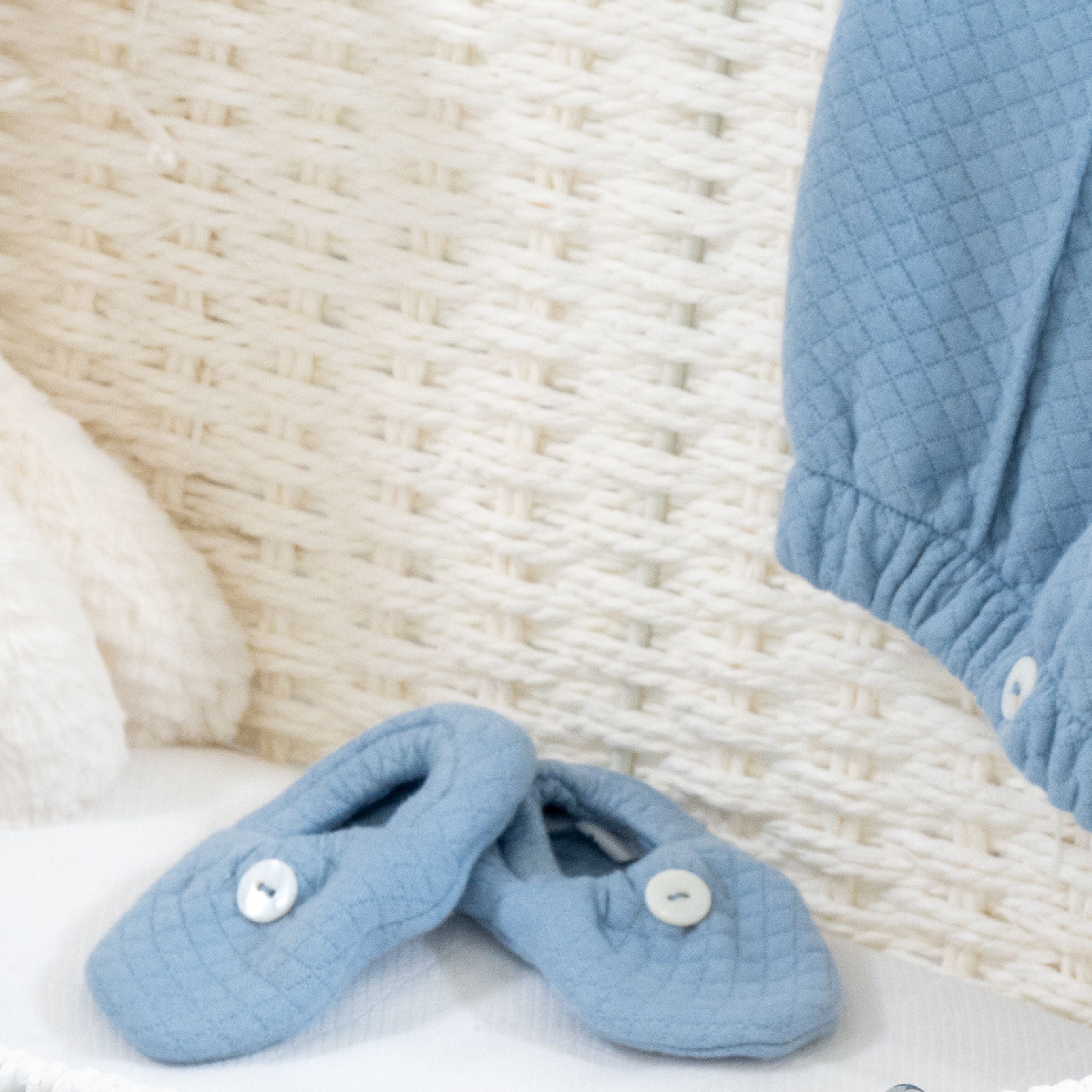 These soft baby booties from the Leo collection are crafted in elegant quilted cotton in a refined Blue Denim shade. Designed to keep baby’s feet warm and comfortable, they feature a delicate rounded shape and a classic button detail on the front.