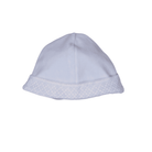 Baby blue layette hat, made in soft cotton velour. This adorable hat has a white lace detailing. Lined with soft cotton jersey, It easily slips on over your babies head to keep them warm.
