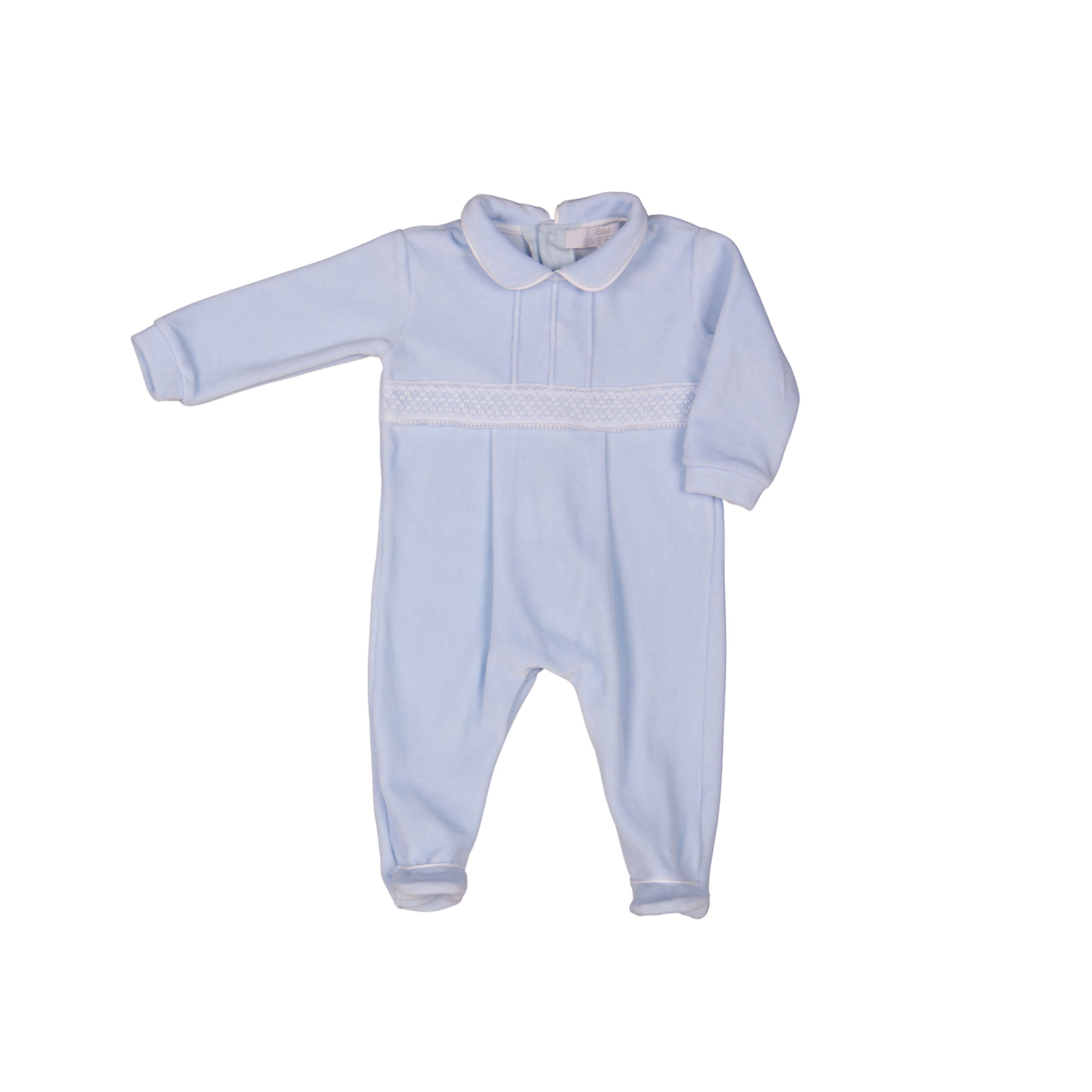 This pale blue newborn all-in-one for boys offers a charming, cosy look. Made in a soft velour, It features a subtle lace trim on the front combined with refined pleated detailing and a sweet rounded collar. This charming style fastens with poppers on the back and between the legs.