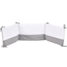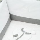 Tour de lit réglable blanc et gris, rembourré et fabriqué en coton doux. S'attache aux barreaux grâce à des petits noeuds, il présente une broderie blanche sur le deuxième panneau.