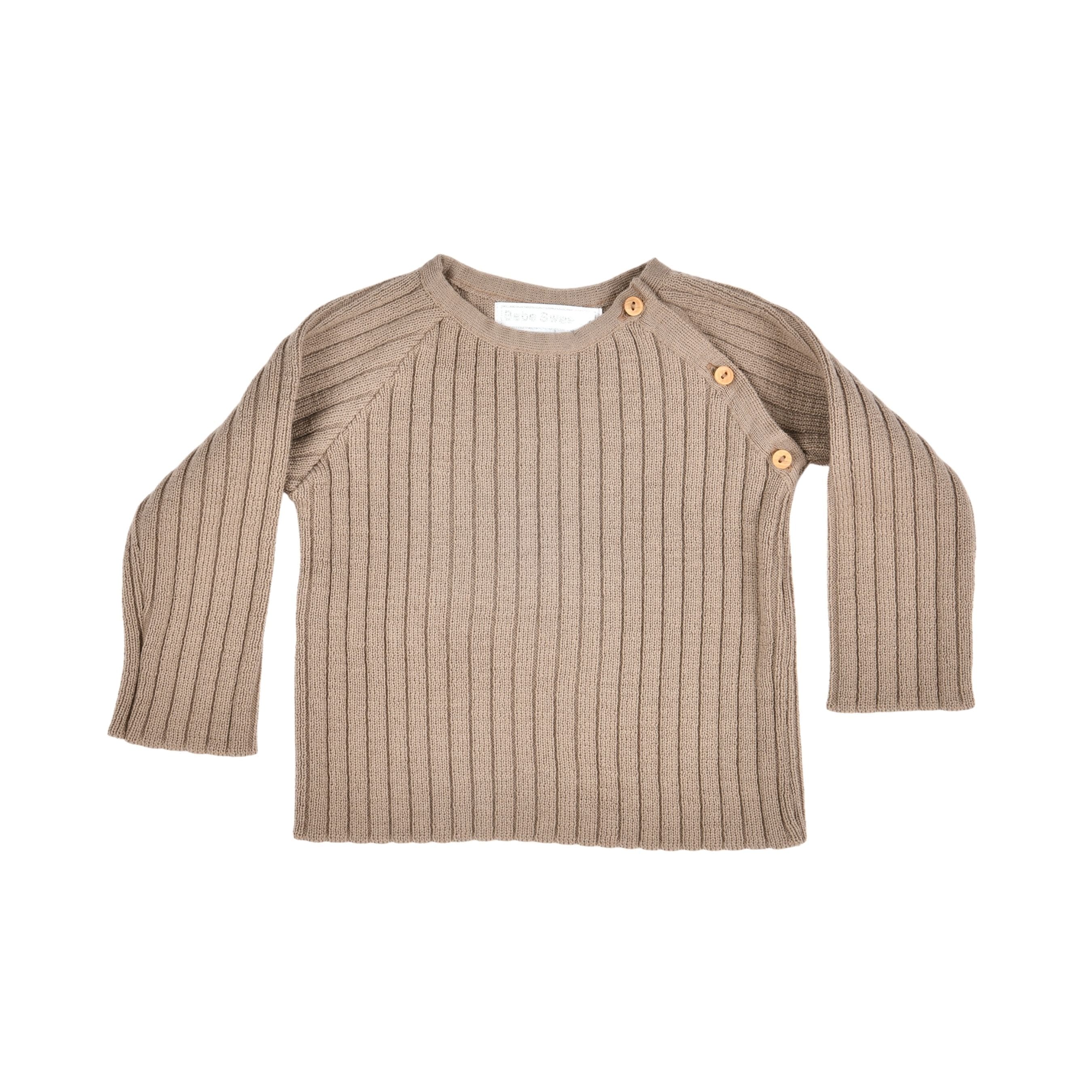 Pull taupe pour garçon, super agréable à porter, il est tricoté dans un mélange de laine extra doux. Se ferme facilement grâce à des boutons en bois beige naturel sur le côté. Un chapeau, des bottines et une couverture assortis sont disponibles dans la même collection.