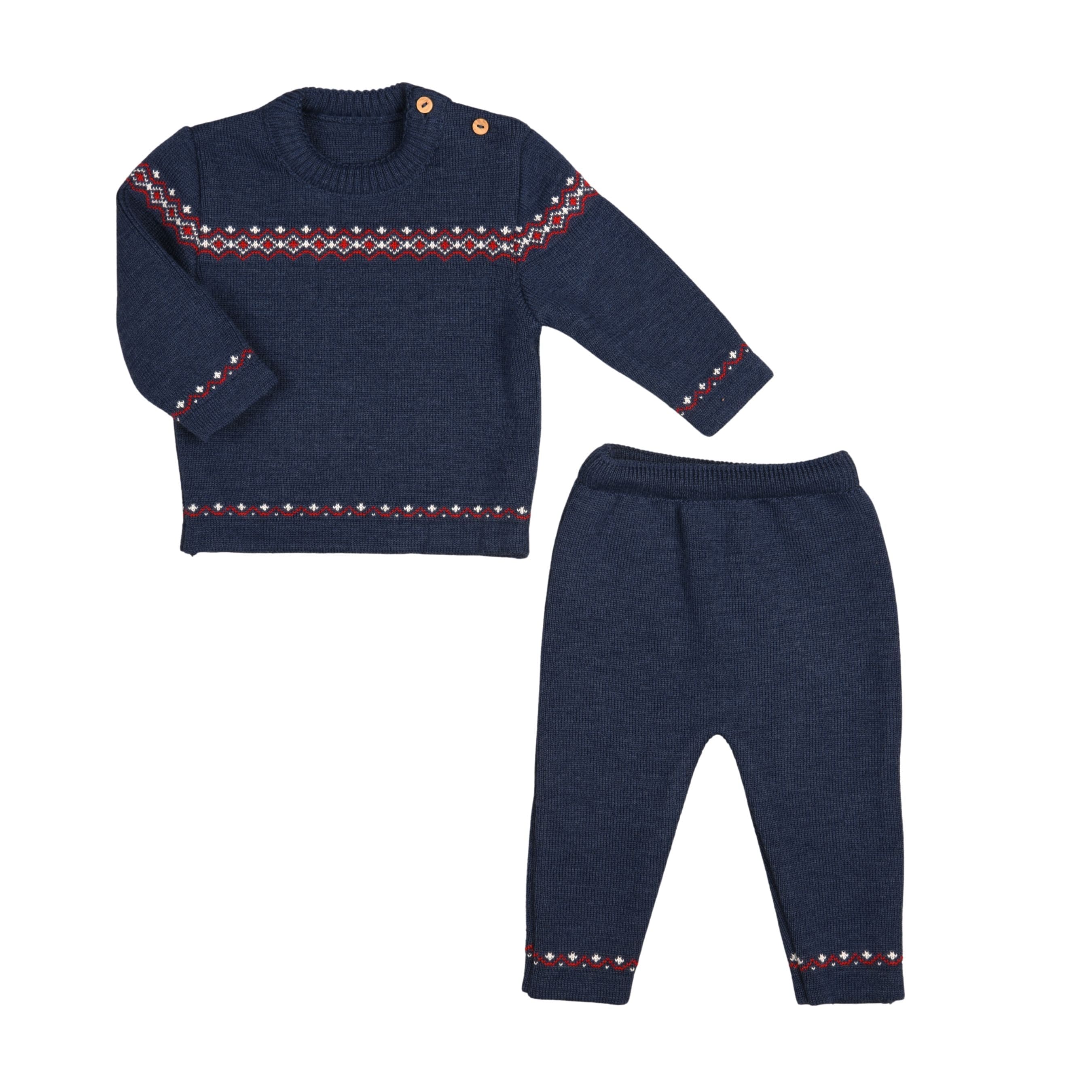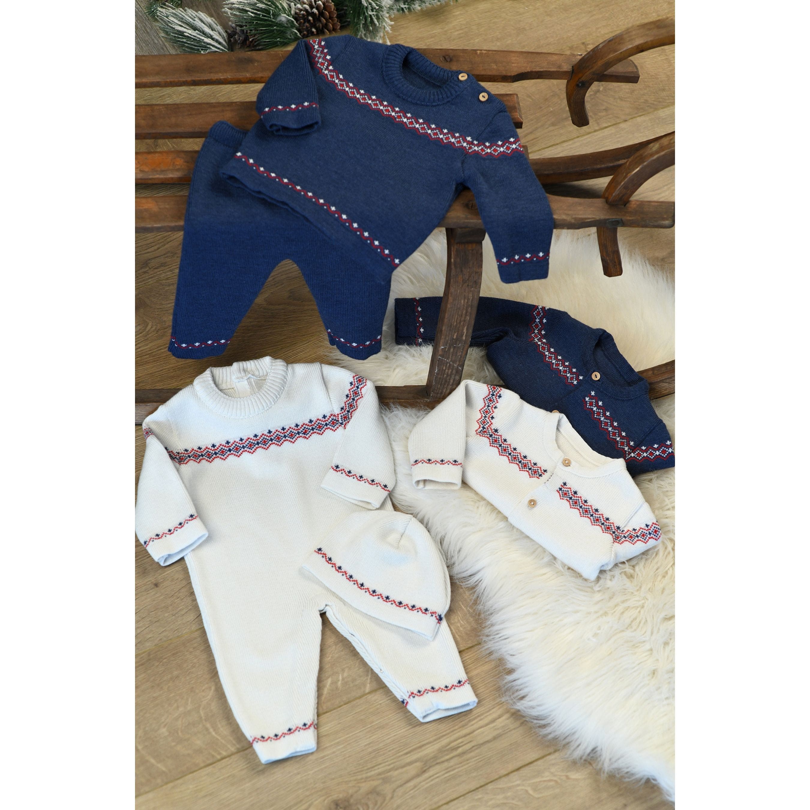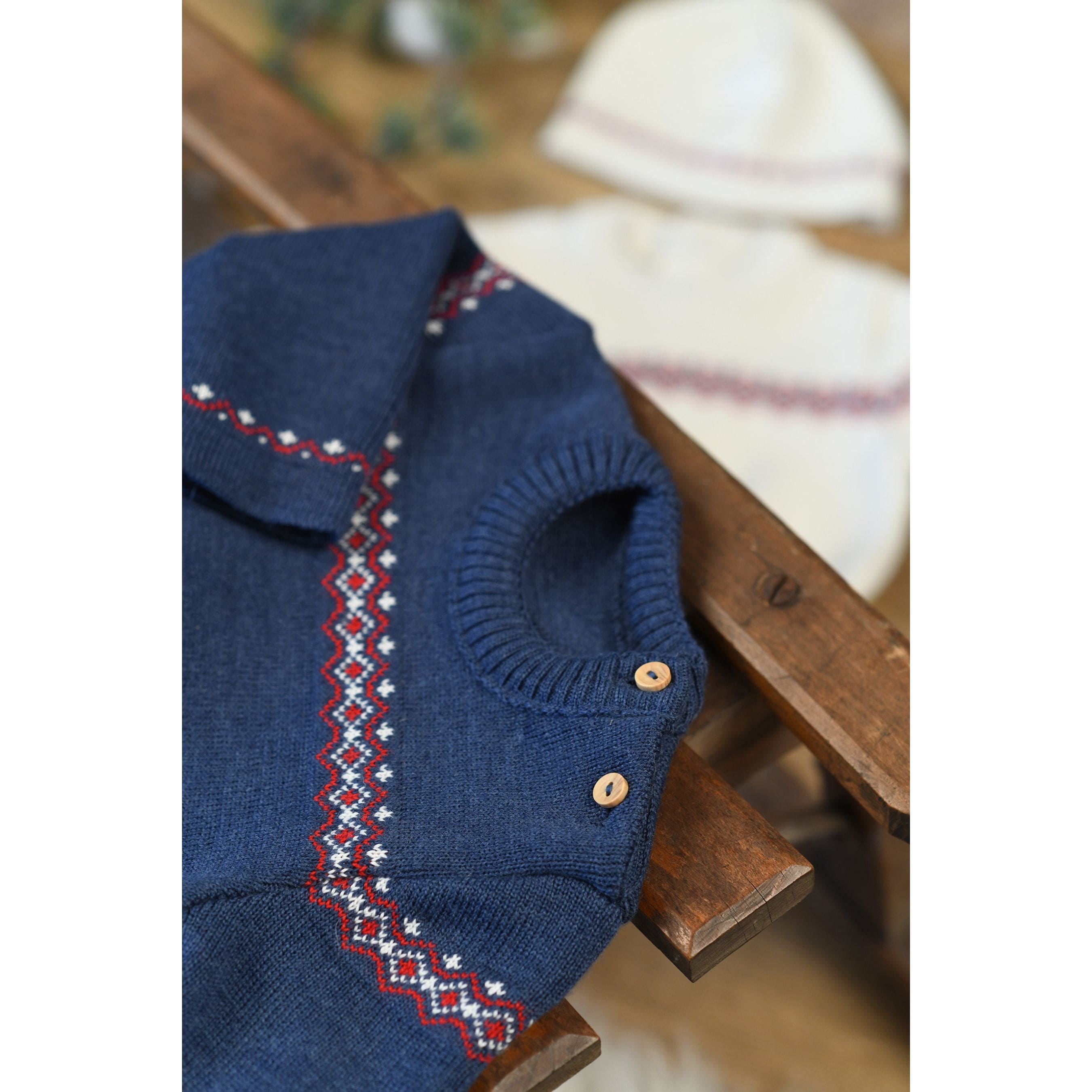 Navy blue knitted set for baby boys made in a luxuriously soft wool blend. This cosy lightweight knit features a charming red and ivory snowflake detailing on the front and cuffs. This set features buttons on the shoulder for easy dressing and an elasticated waistband at the bottom to ensure a comfortable fit.