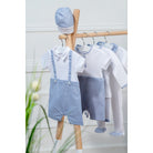 This two-piece set for boys is made from soft quilted cotton, featuring a long-sleeved jacket with blue and white little star trims and mother of pearl button closures. The fitted pants have a lightly elasticated waistband for a comfortable fit, adorned with beautiful buttons.