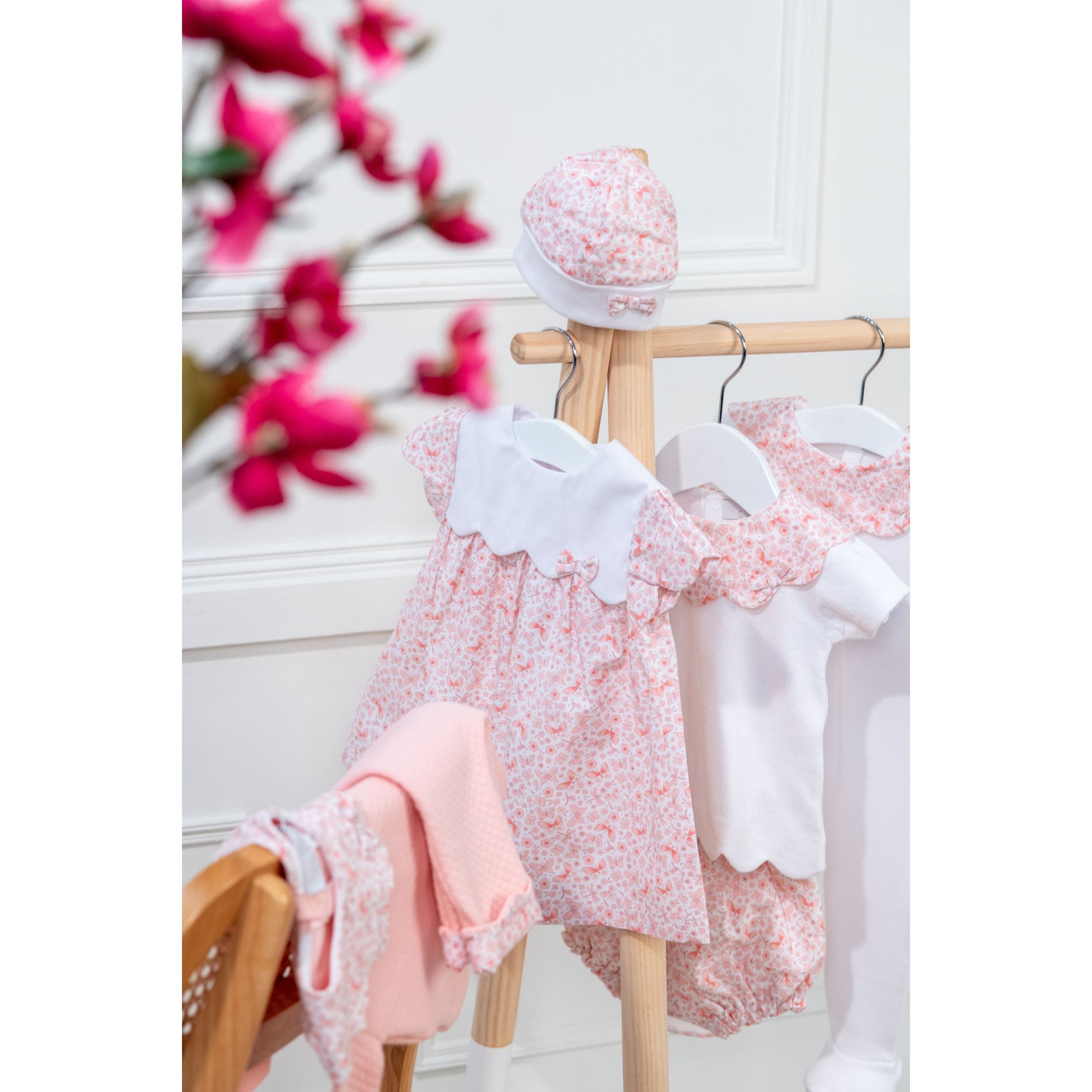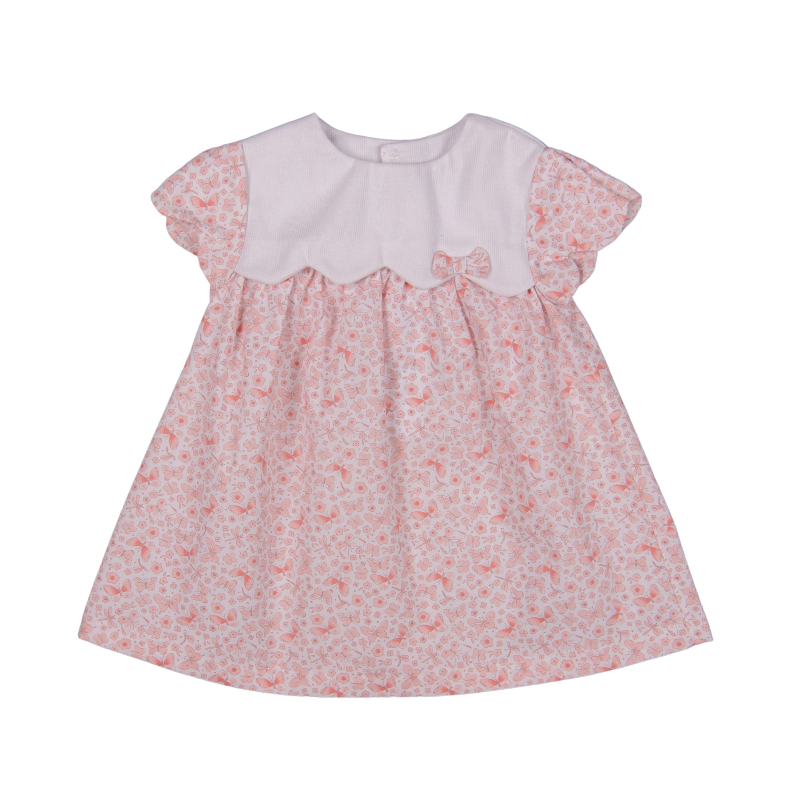 An ode to softness and romantic elegance, this baby girl dress comes in a delightful butterfly print fabric in shades of rose pink. Wear it for a ceremony or everyday with sandals and a hat and fall for this dress with its scalloped bib and gathered details.