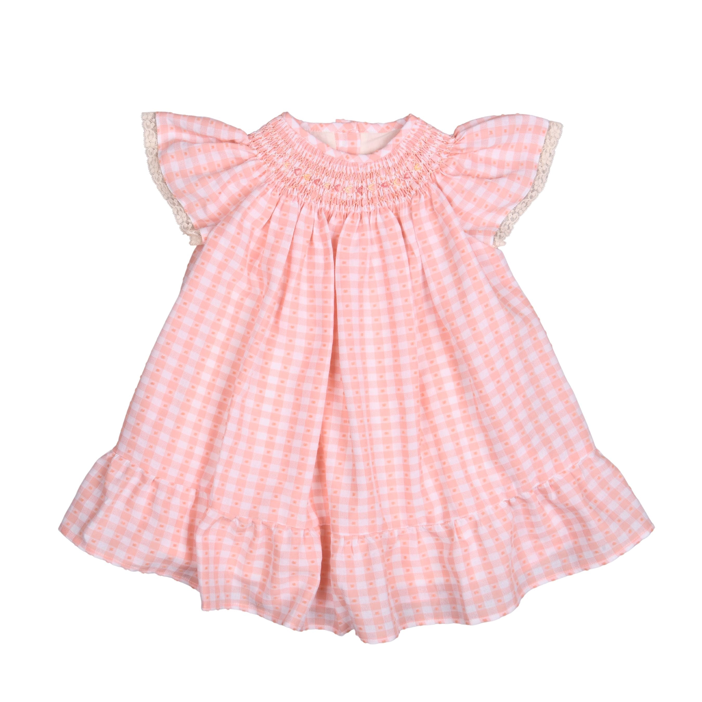 Adorable pink and white gingham check dress for girls with beautiful hand smocking around the neckline. This dress features a hand-embroidered detail in white, pink, and yellow, as well as flutter sleeves with white lace trim.. Made and lined in soft and lightweight polycotton, it fastens with buttons on the back.