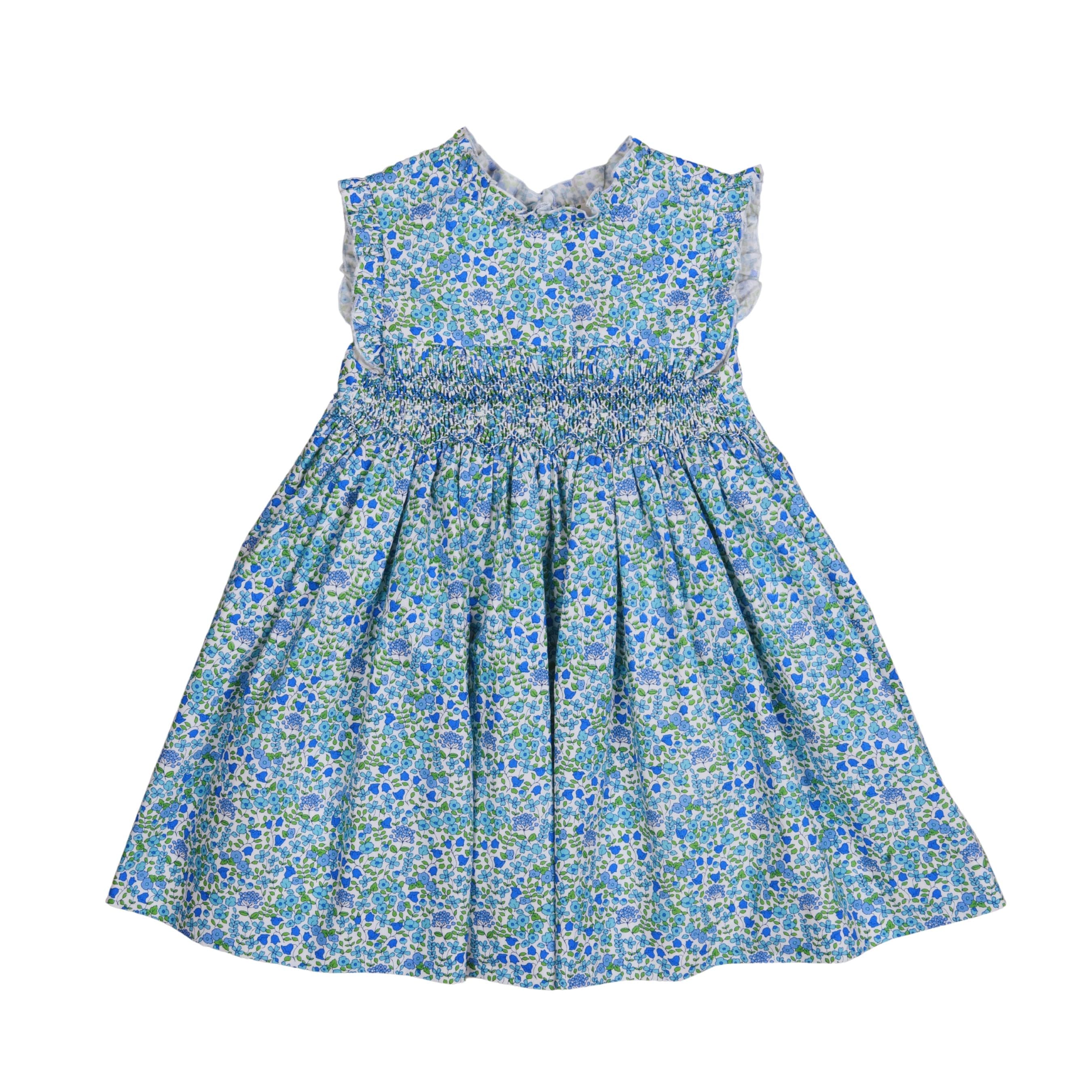 Lovely for traditional styling, a pretty handmade cotton dress for girls, patterned with florals in turquoise blue, pale blue and green. This classic style has ruffled cap sleeves and is beautifully hand-smocked and embroidered on the front to create a full skirt. Expertly designed for ultimate comfort, this dress features a convenient button closure on the back and falls just below the knee.