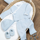 A charming baby essential designed to keep little feet warm and comfortable. The Nola baby booties are crafted in soft quilted cotton in a delicate pale blue shade and finished with a decorative button for a refined and timeless look. Soft and lightweight, they gently wrap baby’s feet while staying comfortably in place thanks to a soft elastic at the back of the heel. These booties coordinate perfectly with the matching baby set available in the same collection.