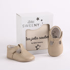 Belles chaussures beiges pré-marcheurs 'Francis' faites à la main en cuir souple. Ils présentent de jolis détails surpiqués autour de la barre en T et une bride de cheville réglable qui s'attache sur le côté à l'aide d'une bride velcro.