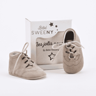 Chaussures pré-marcheur faites à la main, pour bébés garçons. Ils sont confectionnés en cuir suédé sable souple avec des motifs perforés style brogue et des lacets à nouer.