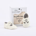 Chaussures blanches faites à la main pour les pré-marcheurs, pour bébés garçons. Ils sont fabriqués en cuir verni souple avec des motifs perforés de style brogue et des lacets à nouer.