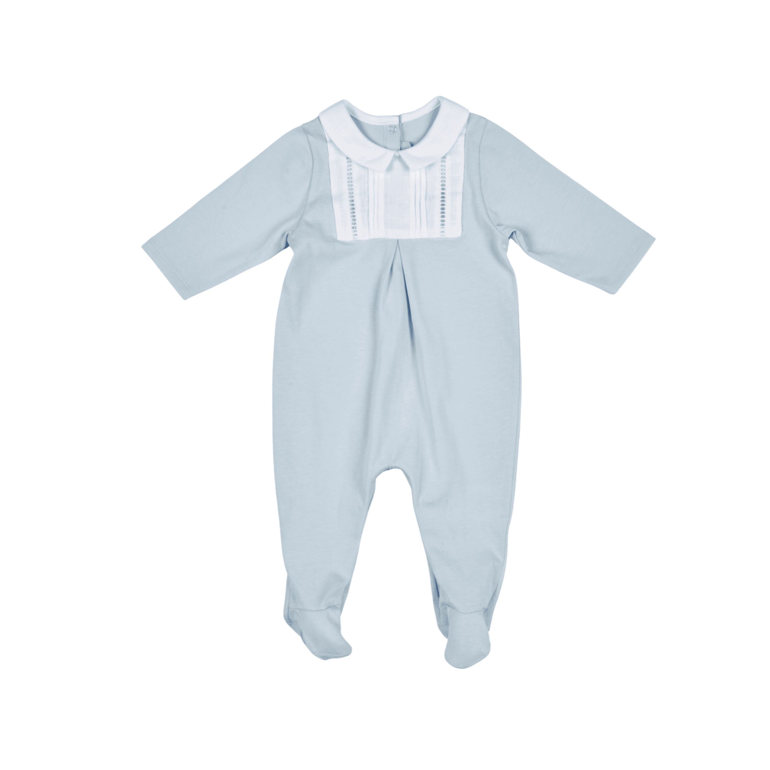 Blue organic cotton all-in-one for baby boys with a chest application in soft linen.