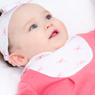 Adorable pink romper for baby girls made in a soft Organic interlock jersey, it has a white bib front with printed pink bows and popper fastenings for easy dressing between the legs and on the back.