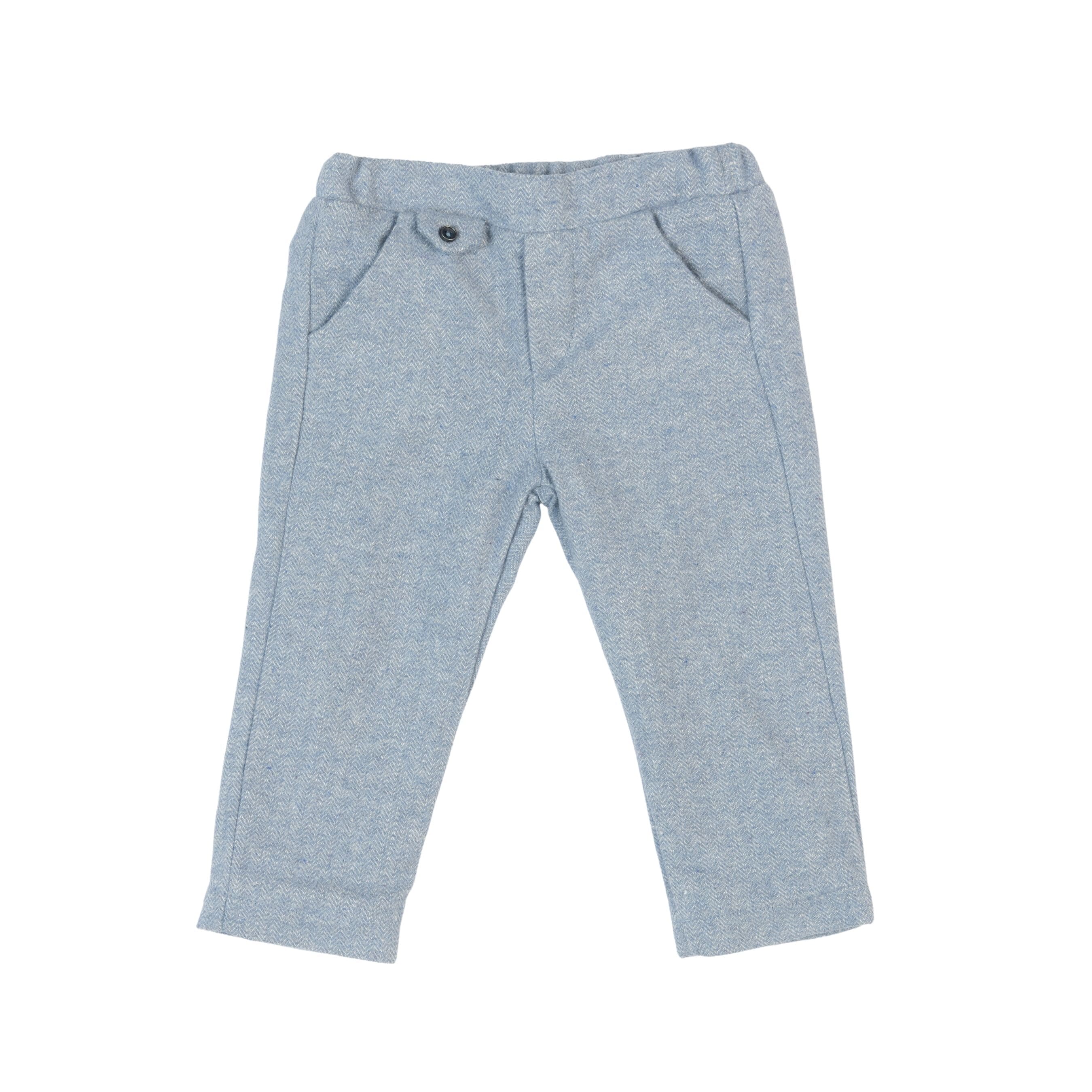 These boys' flannel trousers come in a blue and ivory herringbone pattern and are crafted from a cozy, brushed fabric. They are designed with front and back pockets, elasticated cuffs, a button closure, belt loops, and an adjustable waistband.