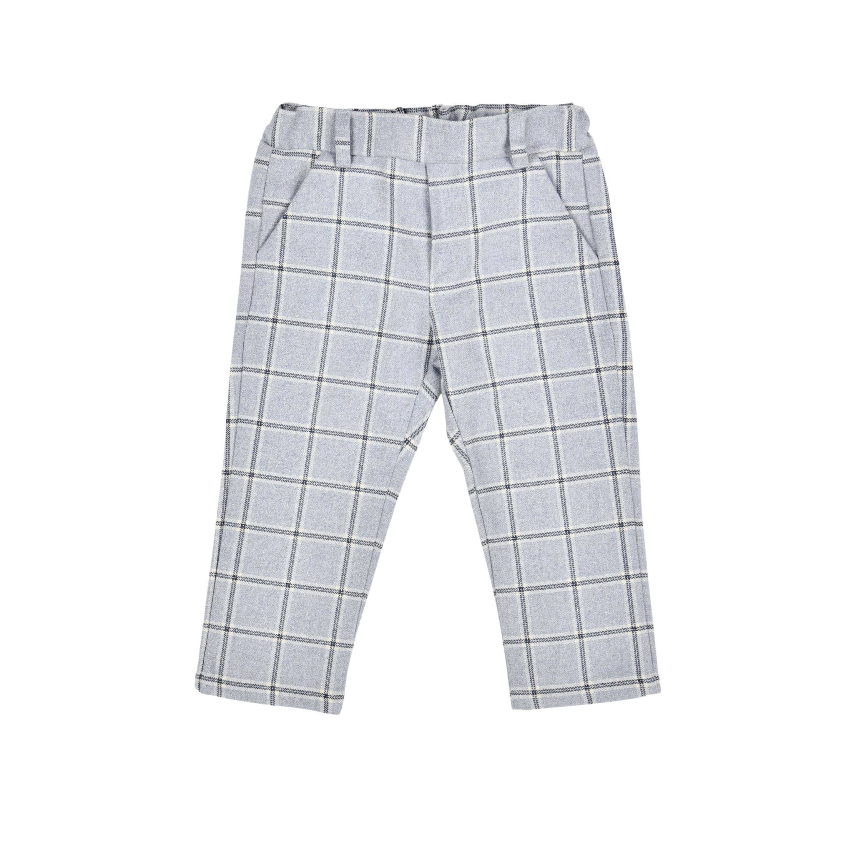 Little boys smart light blue and navy checked trousers made in a soft flannel. They have front pockets, elasticated waist with adjustable waistband on all sizes. These trousers are made from a high-quality flannel material, ensuring both comfort and durability. With front pockets and an adjustable waistband on all sizes, these trousers offer practicality and style.