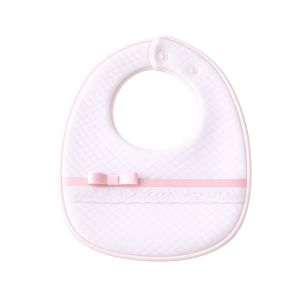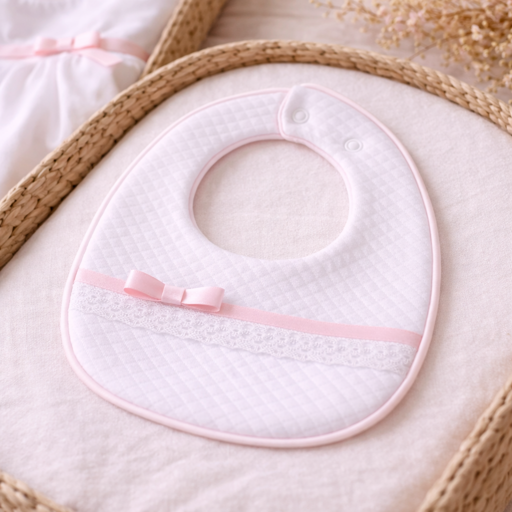 This refined quilted cotton bib is crafted in soft white fabric, enhanced with a delicate pink satin ribbon and a flat bow detail for a subtle, elegant finish. A fine lace trim adds a timeless touch, making it both practical and beautifully delicate. Designed for everyday use, it offers excellent absorbency while remaining soft and comfortable against baby’s skin.