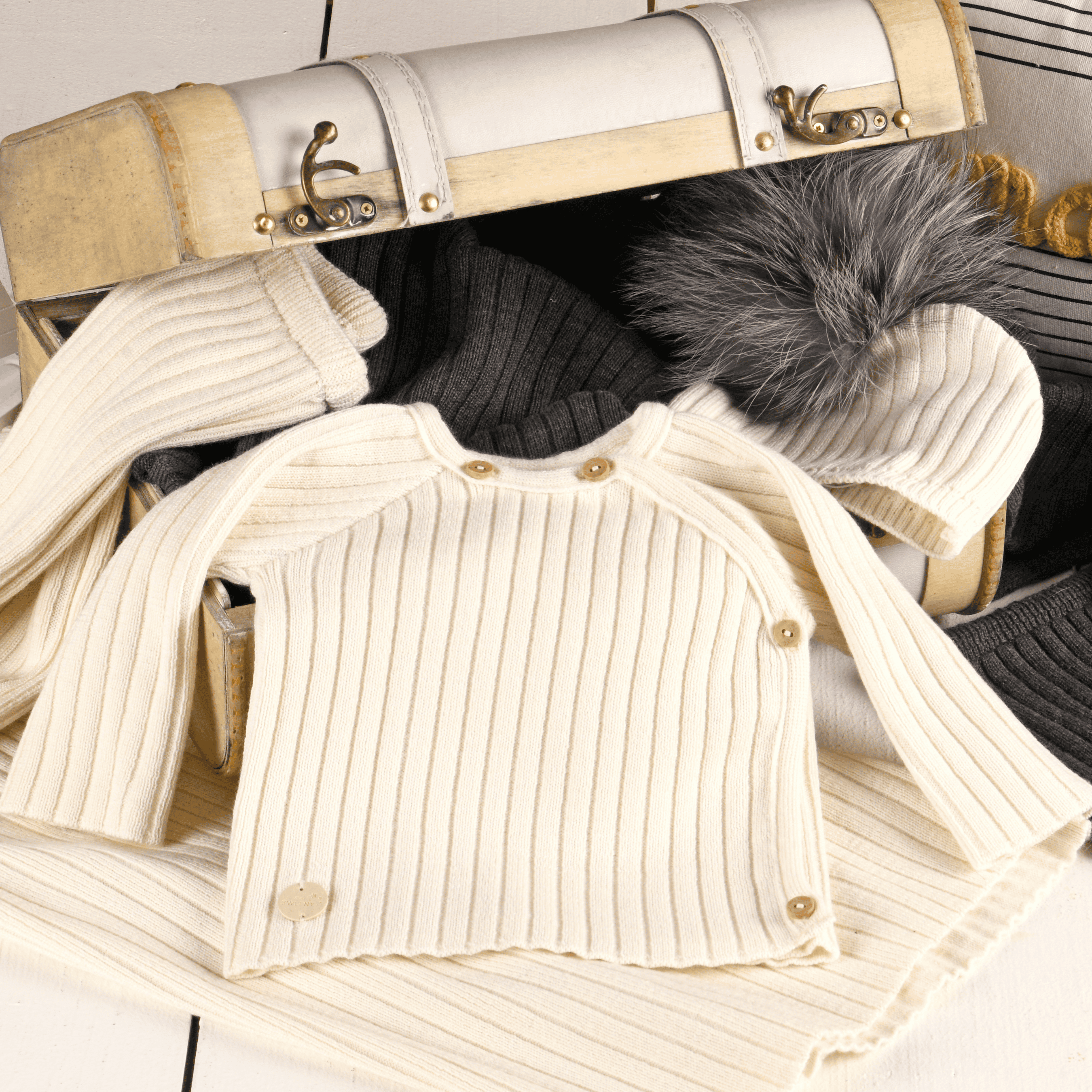 Baby girls and boy gorgeous cream trouser set. Super soft and comfortable, the sweater  fastens on the side with natural beige wooden buttons. The matching trousers are full length and have an elasticated waistband. Complete the set with the matching hat and blanket available in the same collection.