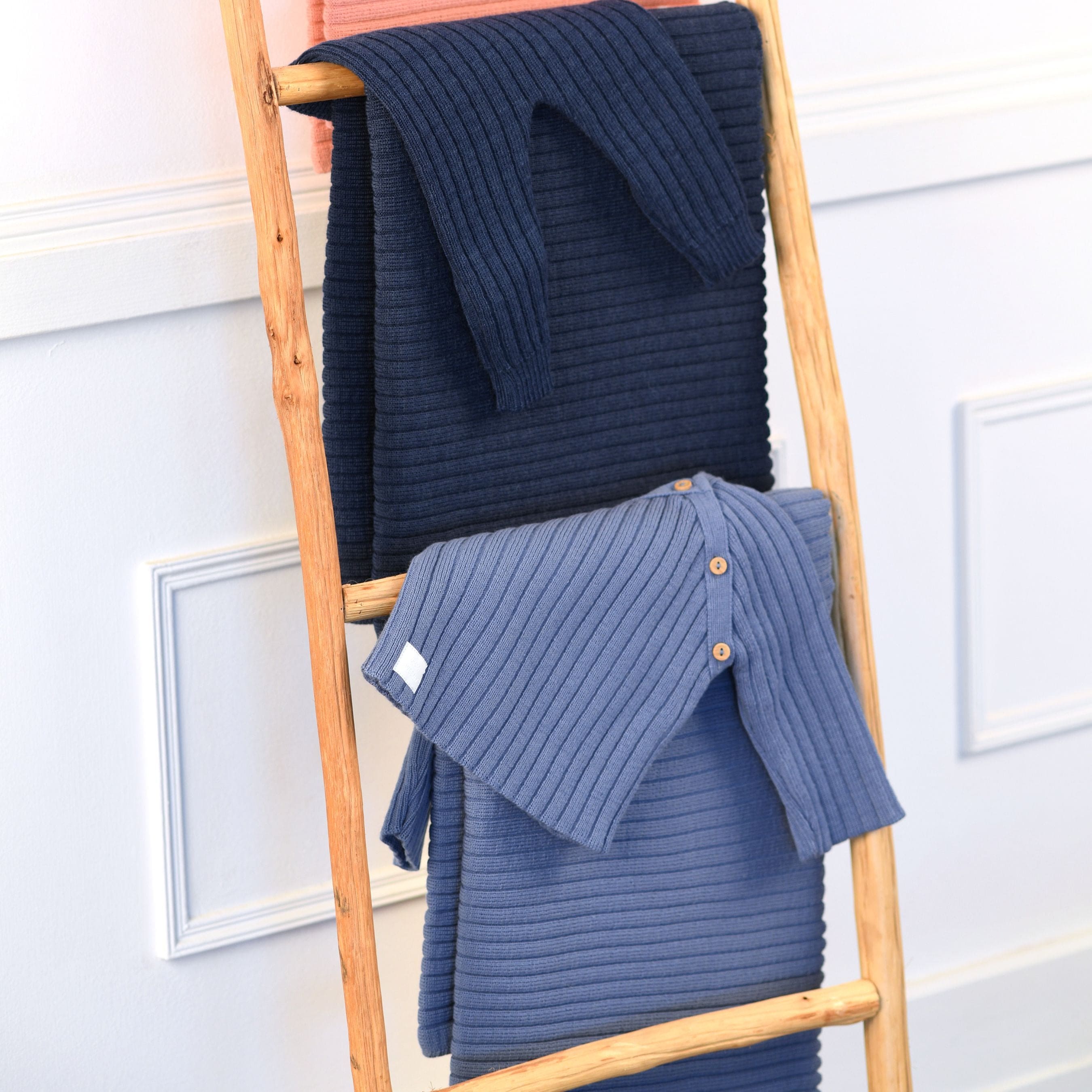 Baby boys gorgeous navy blue trousers set in ribbed knit. Super soft and comfortable, the sweater fastens on the side with natural beige wooden buttons. The matching trousers are full length and have an elasticated waistband. Complete the set with the matching hat and blanket available in the same collection.