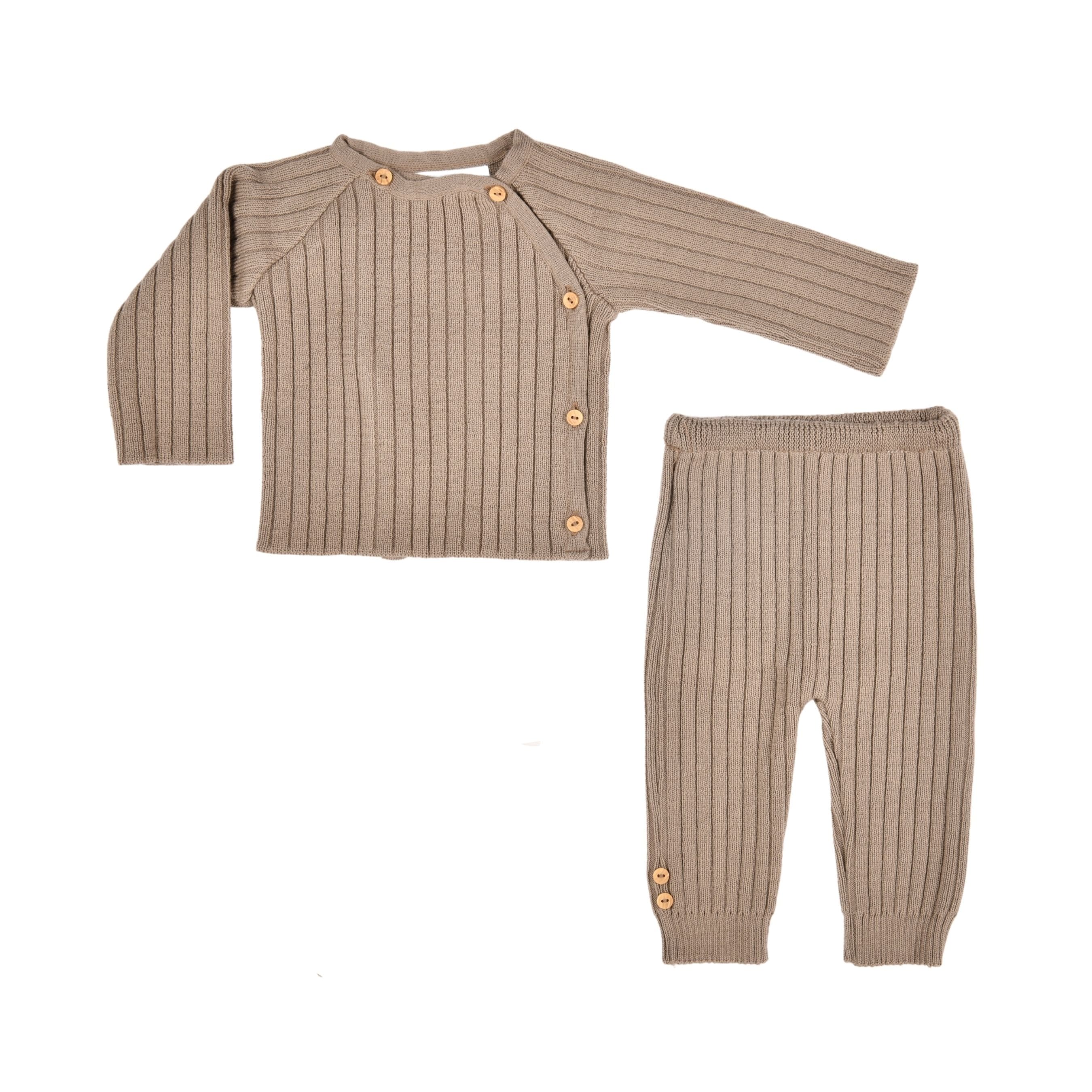 Baby boy gorgeous taupe trouser set. Super soft and comfortable, the sweater fastens on the side with natural beige wooden buttons. The matching trousers are full length and have an elasticated waistband. Complete the set with the matching hat and blanket available in the same collection.