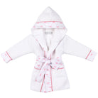 A lovely, super soft white bathrobe for baby girls. Ideal for bath time, it has front pockets and a belt tie. The sleeves, pockets and hood have cotton poplin trim with pink bow print.