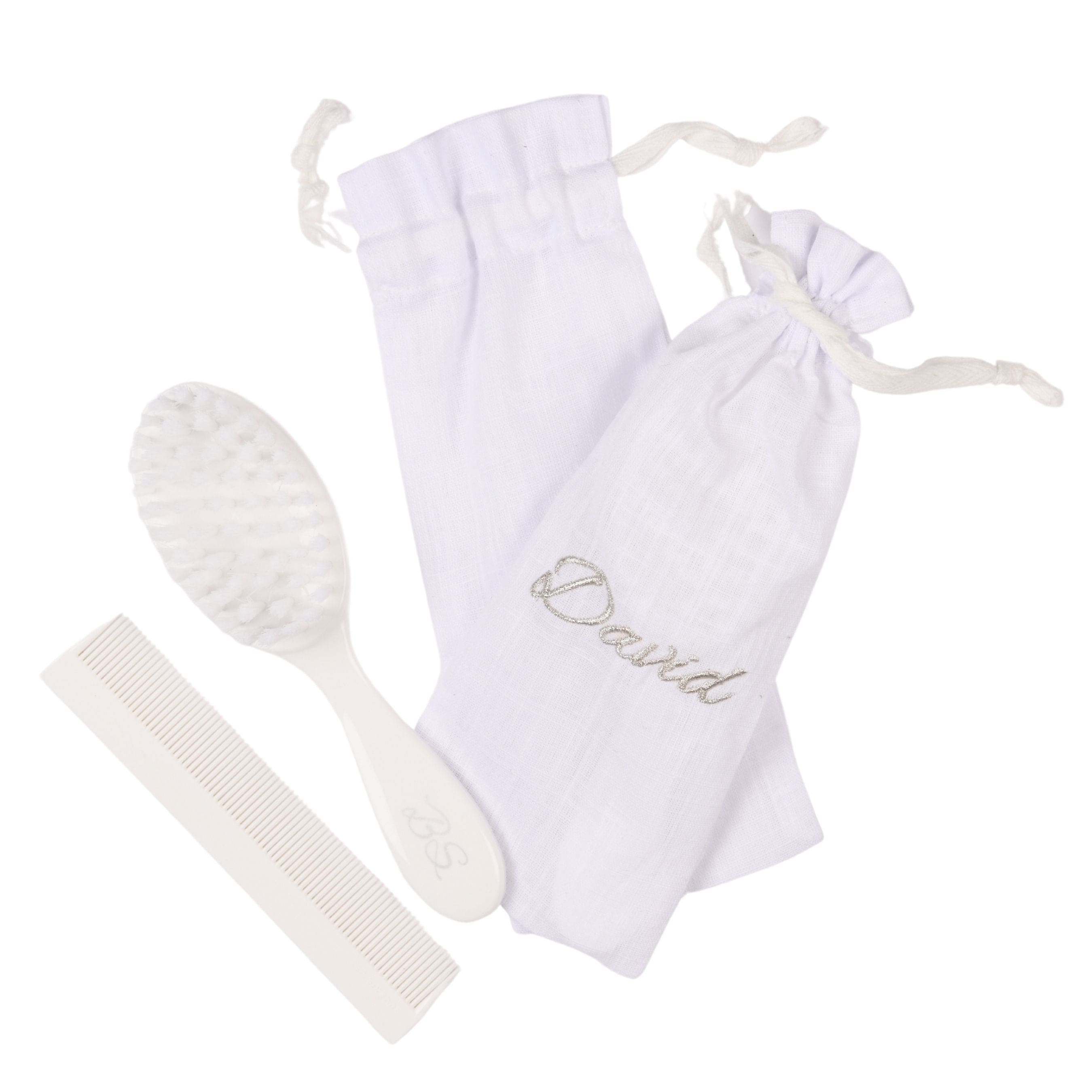 Baby hairbrush and comb set in white with logo initials on the front in silver. The brush has soft, silky bristles and the comb has fine tooth.  A white cotton bag is included and can be personalised with an embroidered name or initials.  Lovely to care for baby's hair.