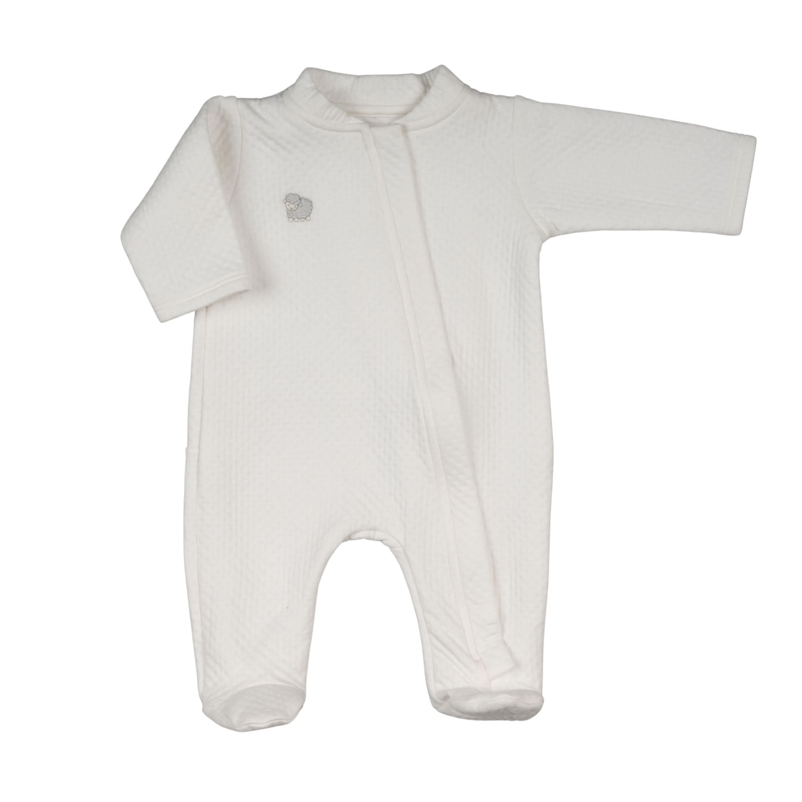 Ivory pramsuit for baby boys and girls, made in beautifully soft Pima cotton jersey with a delicate quilted effect. Cosy and warm for those cooler days, it is lightly padded. There is a cute sheep embroidery on the chest and an easy-to-use zip fastening on the front. A coordinating hat can be added to complete the ideal cozy outfit for a newborn.