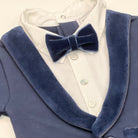 A charming navy blue all-in-one for boys, made from super soft organic cotton jersey, great for a smart occasion. With the appearance of a two piece, this one piece babysuit has a blazer overlay with faux pockets and button fastenings and It fastens with poppers on the back.