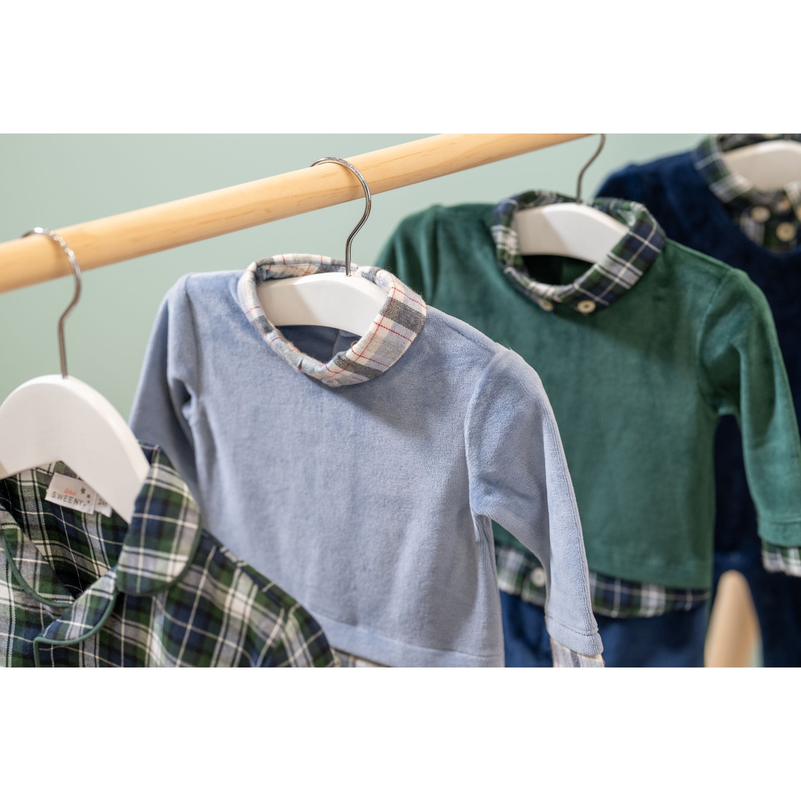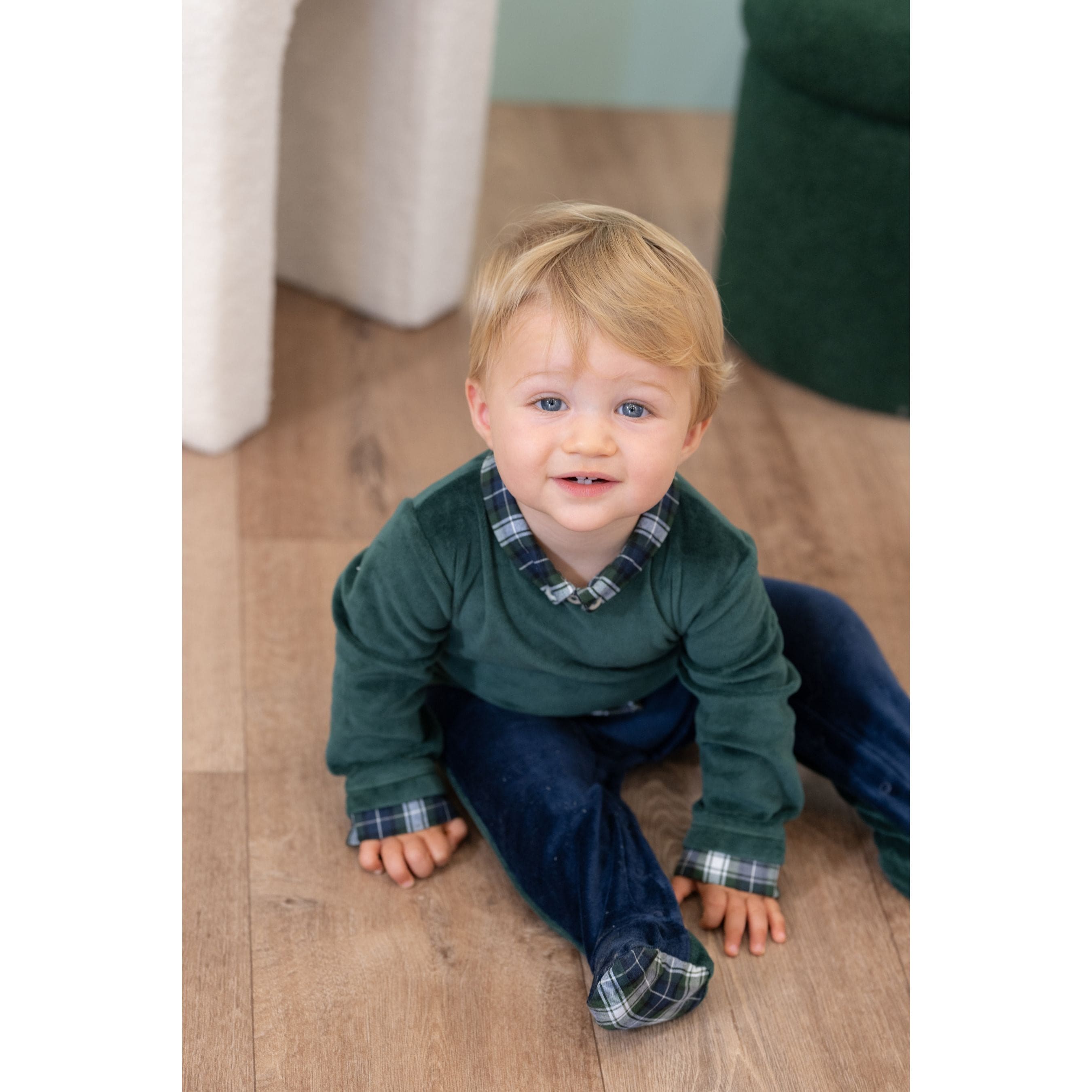 This adorable all-in-one for boys is made from soft velour, designed to resemble a stylish three-piece outfit for added charm and comfort. The front of the bodice has the appearance of a green sweatshirt, and with a green check shirt below. The lower part and back are in navy blue velour with checked soles on the feet and popper fastenings on the back and between the legs.