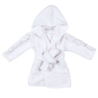 A lovely, super soft white bathrobe for baby girl ideal for bath time. It has front pockets and a belt tie, pretty broderie anglaise frills over the shoulders and on the front pockets and trimmed with white piping.