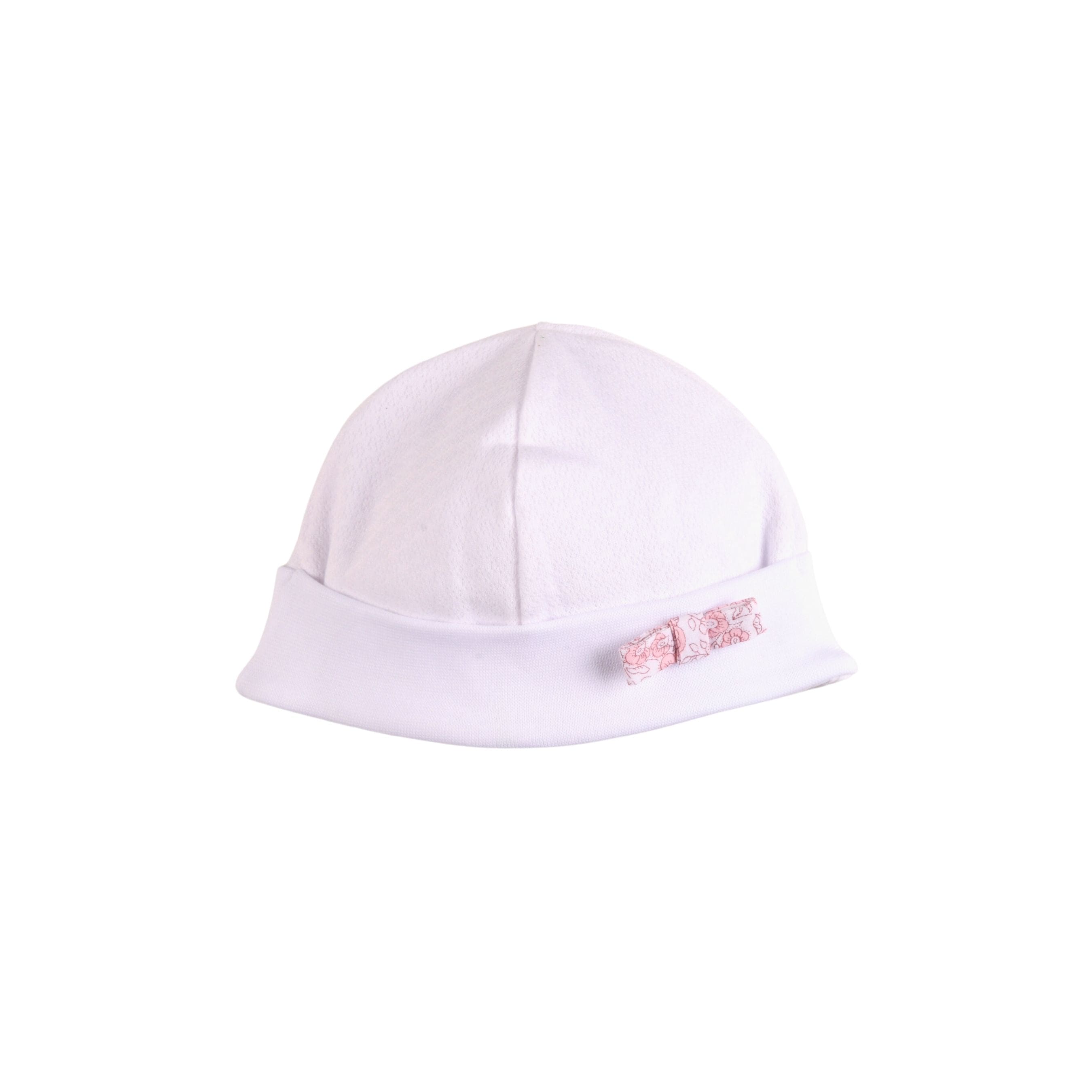 Baby girls white layette hat, made in soft cotton velour. This adorable hat has a flower print bow on the side for a girly look. Lined with soft cotton jersey, It easily slips on over your babies head to keep them warm.