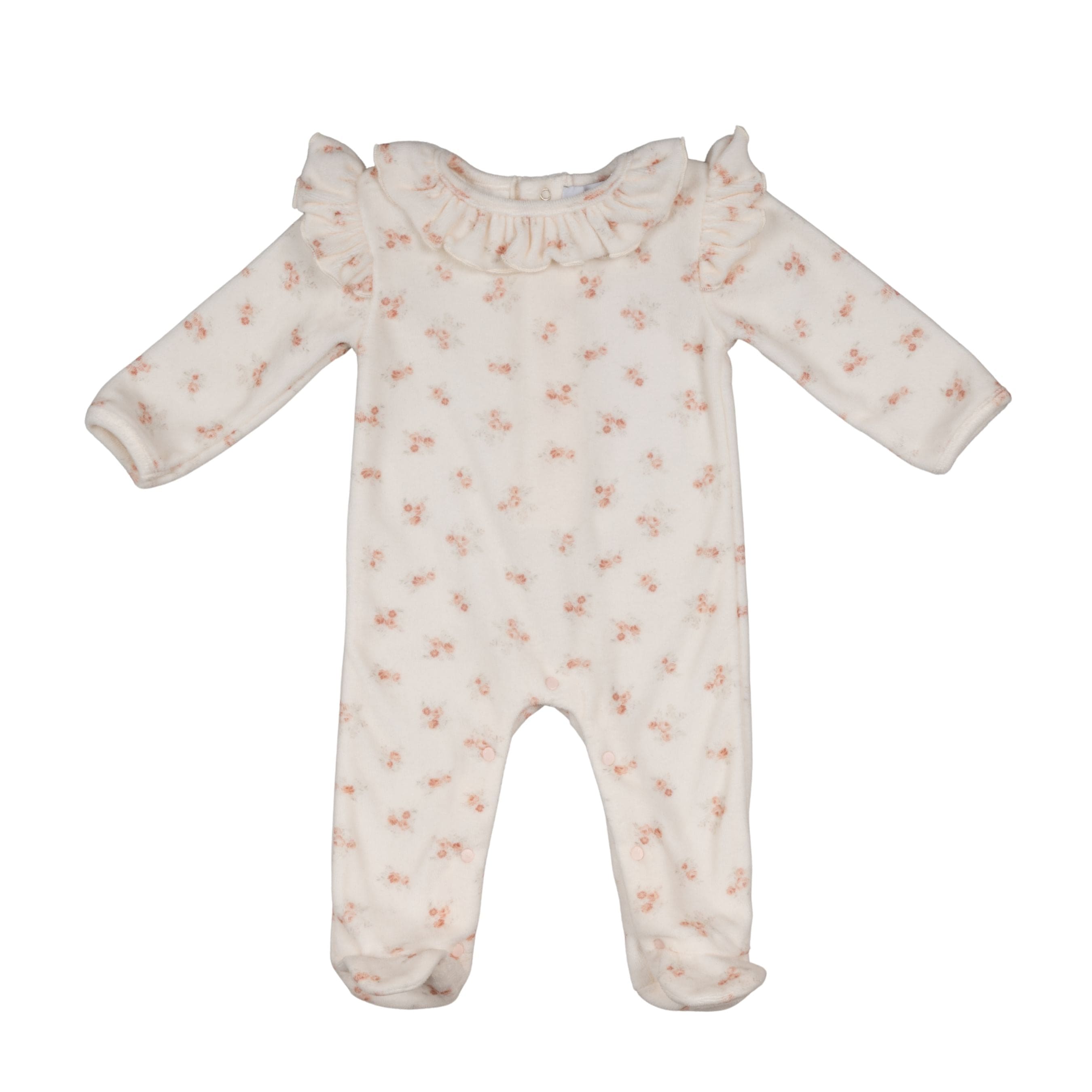 Adorable ivory and pink all-in-one for baby girls. Made in soft cotton velour, this comfortable piece is patterned with a floral print and has pretty ruffles on the shoulders. It fastens with poppers on the back and between the legs for easy dressing.