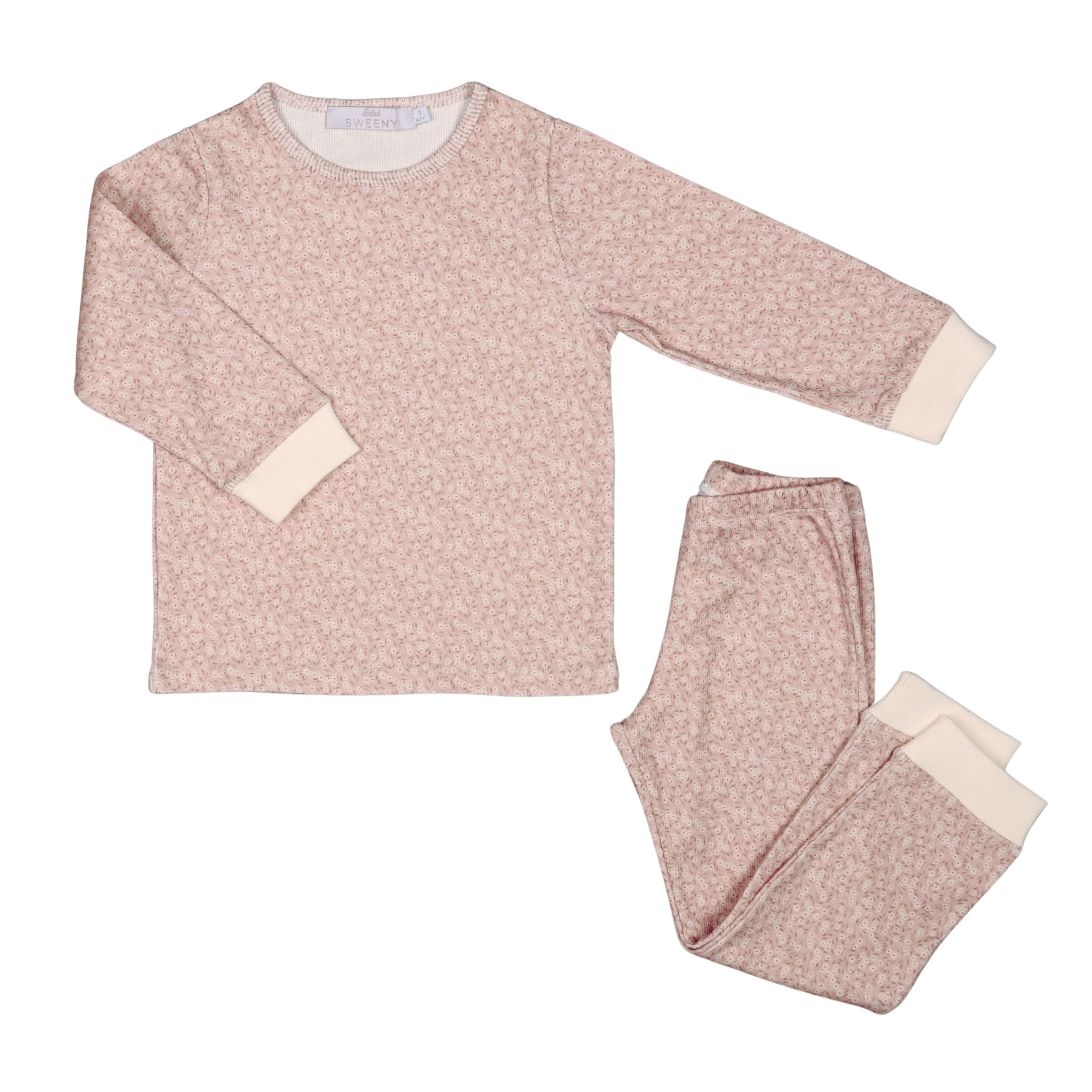 Pink and ivory two-piece set for girls, made in super soft and stretchy ribbed cotton jersey. Snug fitting, they are patterned with a soft pink and ivory floral print and have cosy ribbed trims and a comfortable elasticated waistband on the bottoms.