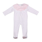 White all-in-one for girls, made in beautifully soft cotton jersey. It has a lovely white and pink gingham cotton collar with a bow detail. The collar is secured with a stitch on both the shoulder and the front. There are easy popper fastenings on the back for neatly and easy changing. Complete the look with the matching hat available in the same collection.