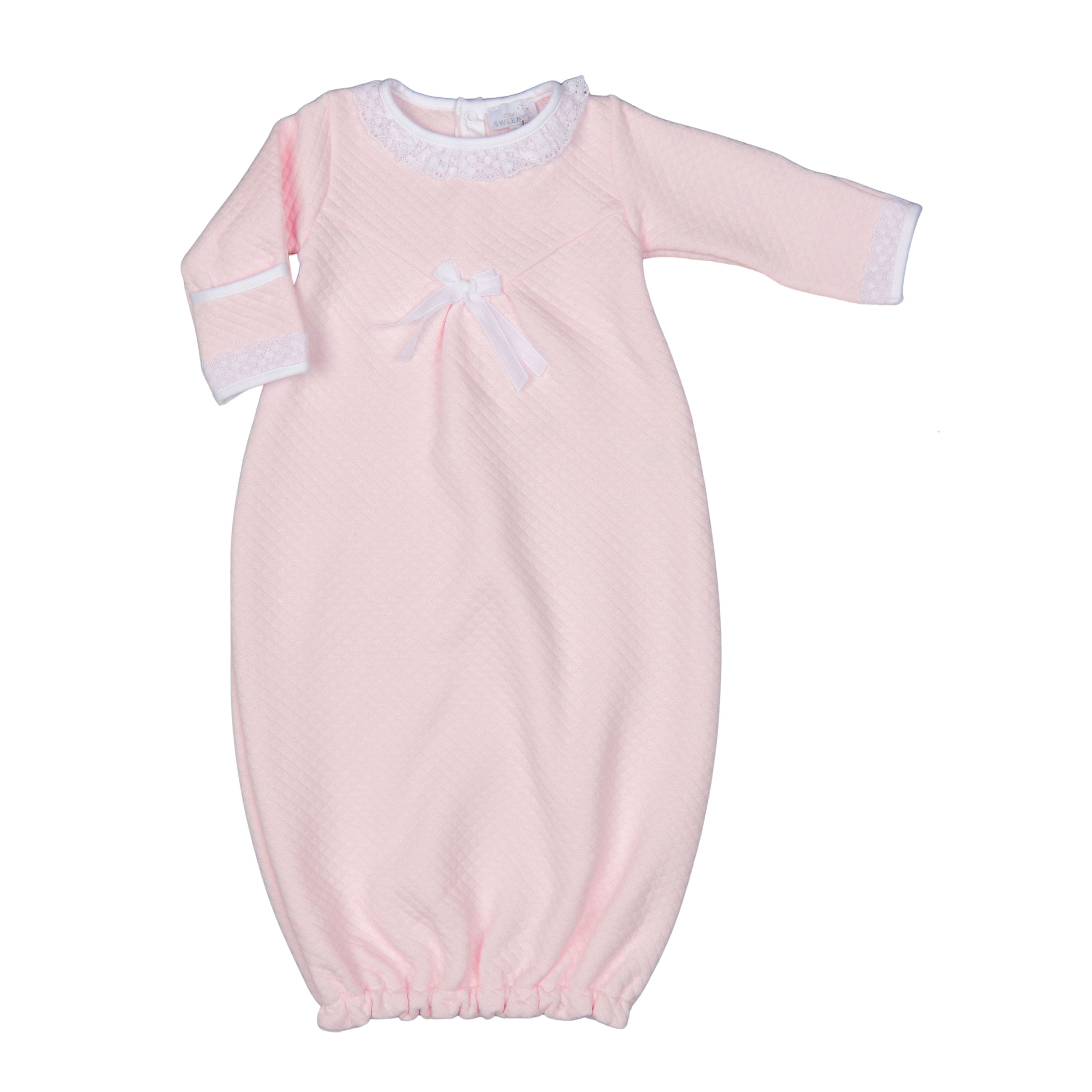 A delicate newborn essential designed for softness and comfort. The Nola baby gown is crafted in soft quilted cotton in a gentle pale pink shade and finished with delicate lace details and a small decorative bow for a refined and timeless look.