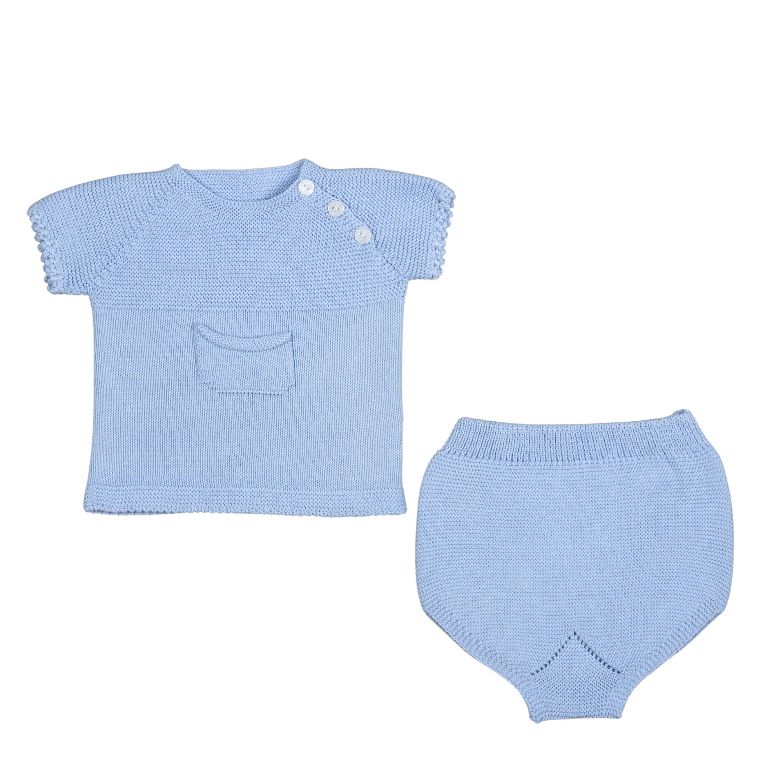 Cute pale blue shorts set for baby boys, finely knitted in soft cotton. Fastening with buttons on the side, the short-sleeved top has smart trims and decorative pocket on the front., the coordinating shorts have ribbed trims for a comfortable fit.