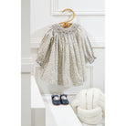 This navy blue & pink cotton dress for young girls features a charming floral pattern. Lightweight and comfortable, it showcases a finely embroidered, hand-smocked neckline that adds a classic touch. Perfect for Autumn outfits, the dress is fully lined and closes with button fastening on the back for ease of wear.