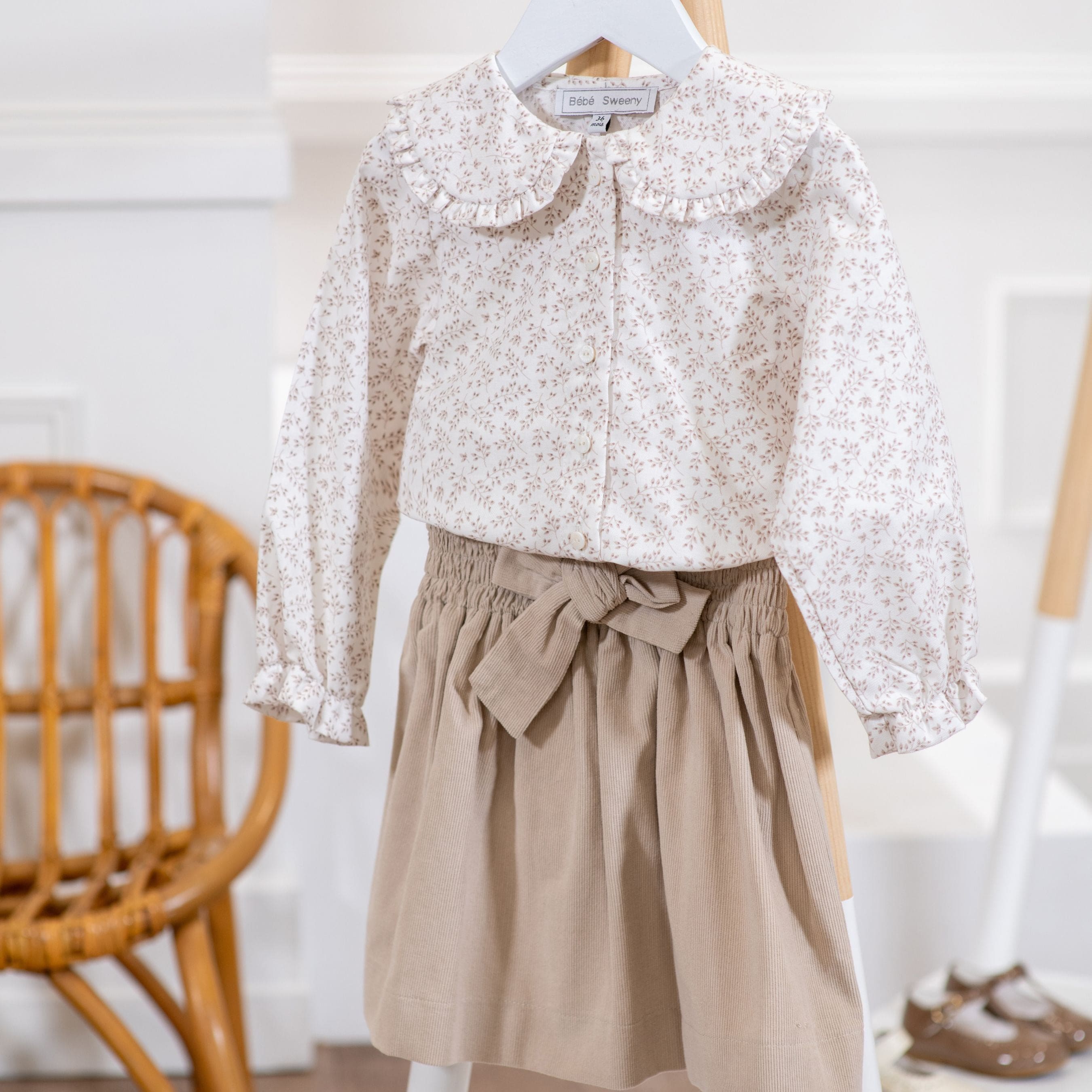 This beige skirt for girls is made in soft ribbed velour and has an elasticated waistband for a comfortable fit. The piece features a decorative bow at the front that adds an elegant finishing touch. Elevate your daughter's wardrobe by styling this beige velour skirt with one of our coordinating floral print blouses for a refined outfit.