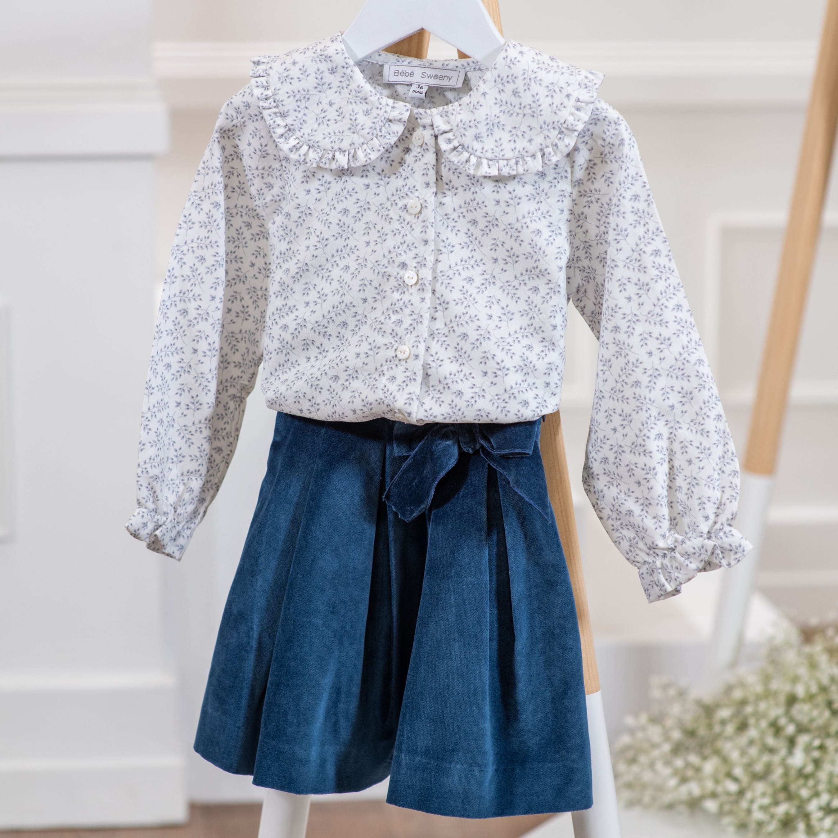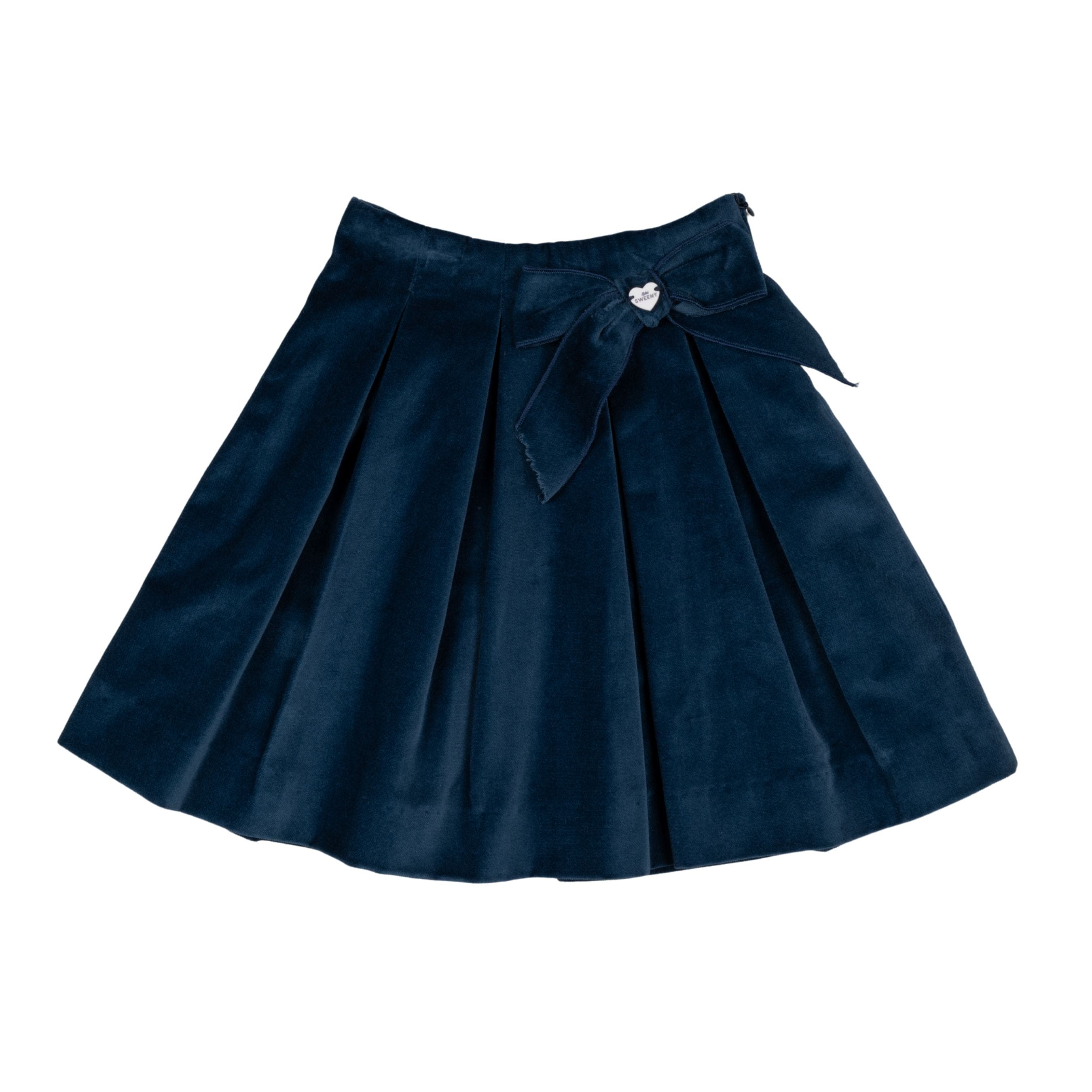 This blue skirt for girls is made in soft velour and has an elasticated waistband for a comfortable fit. The piece features a decorative bow at the front that adds an elegant finishing touch. Elevate your daughter's wardrobe by styling this blue velour skirt with one of our coordinating floral print blouses for a refined outfit.