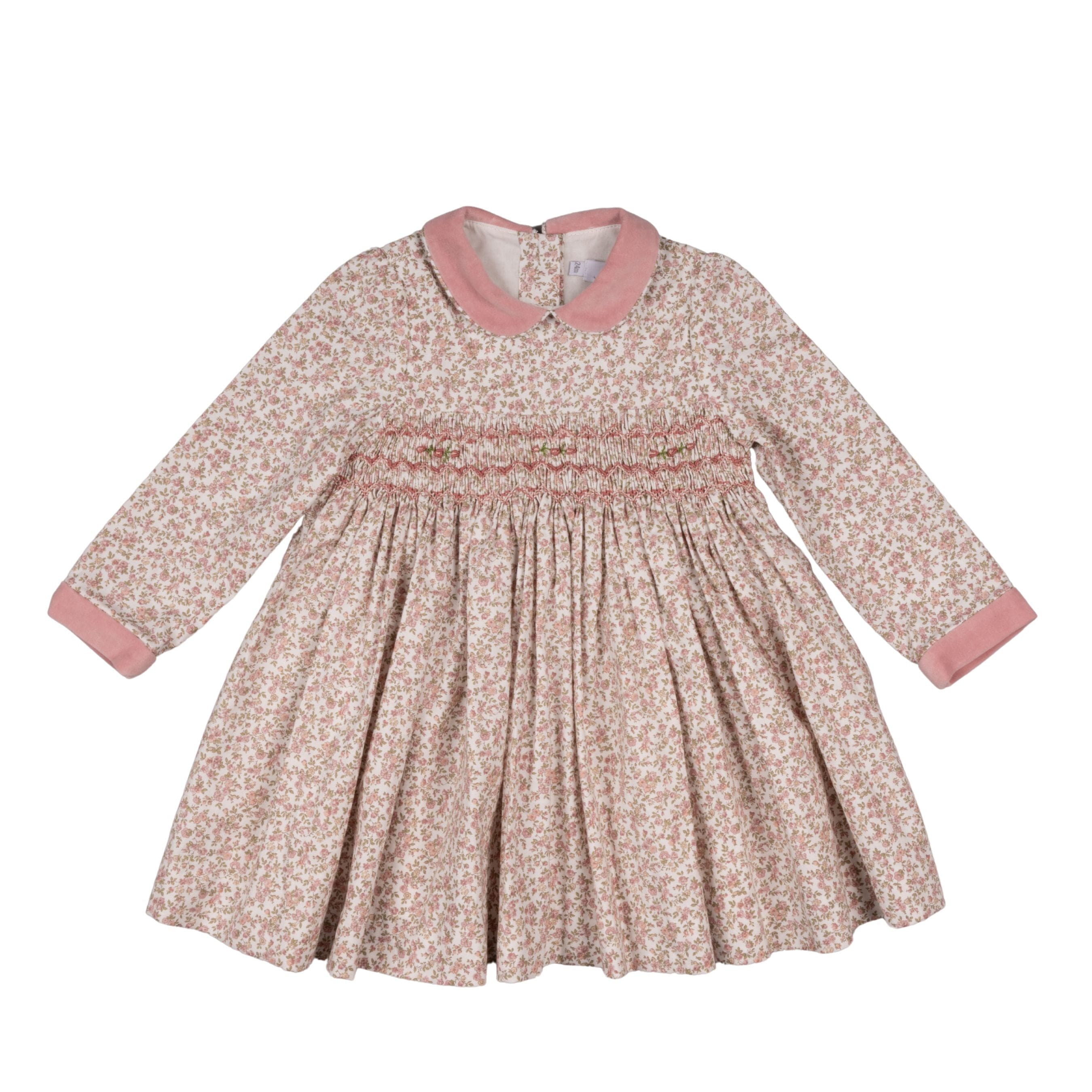 FRIDA | Girls Ivory & Pink Cotton Floral Hand-Smocked Dress with Velvet Collar